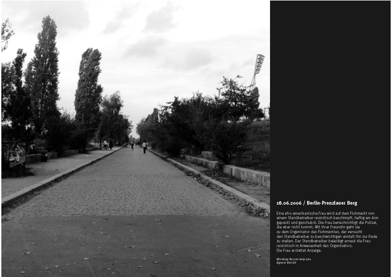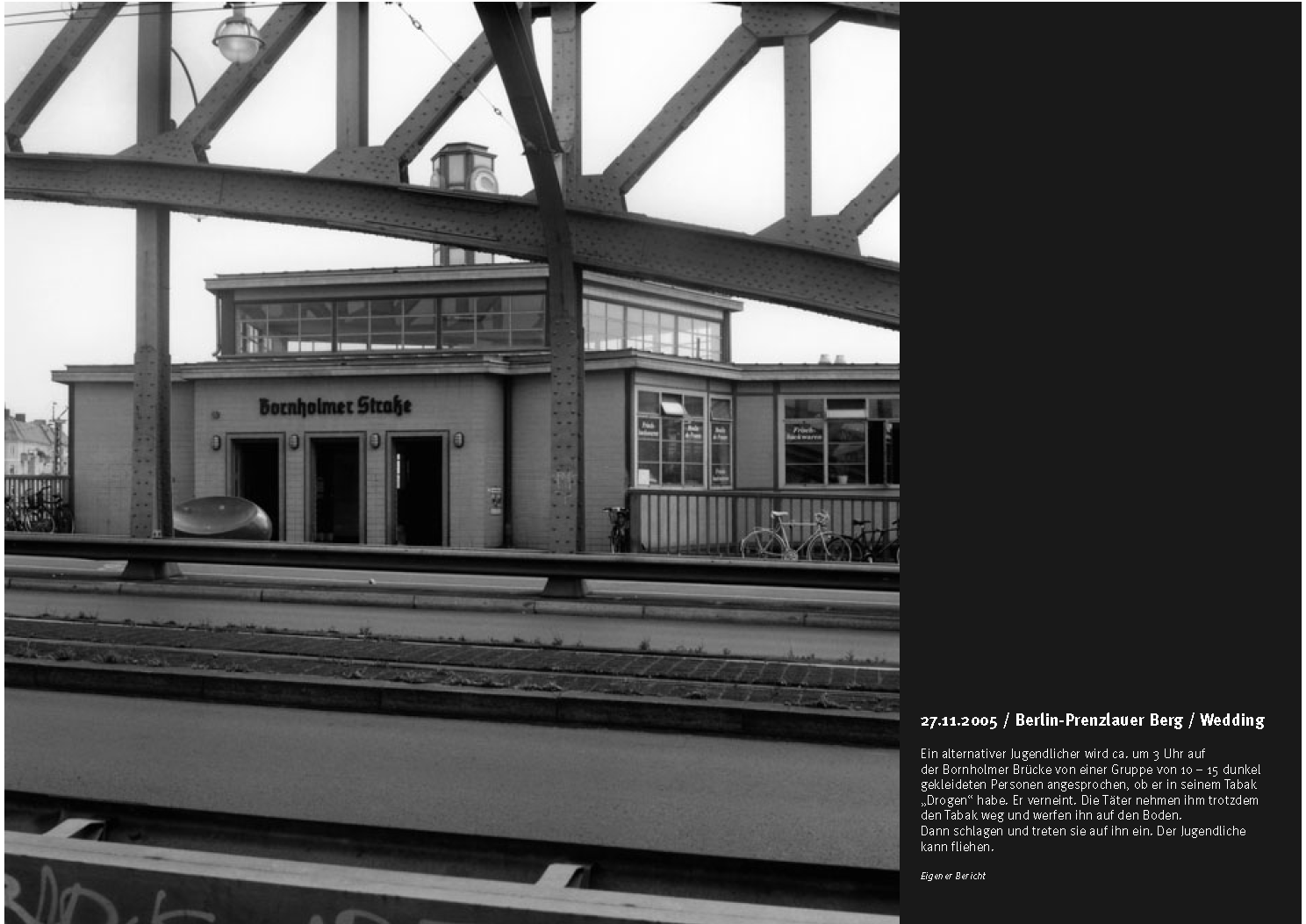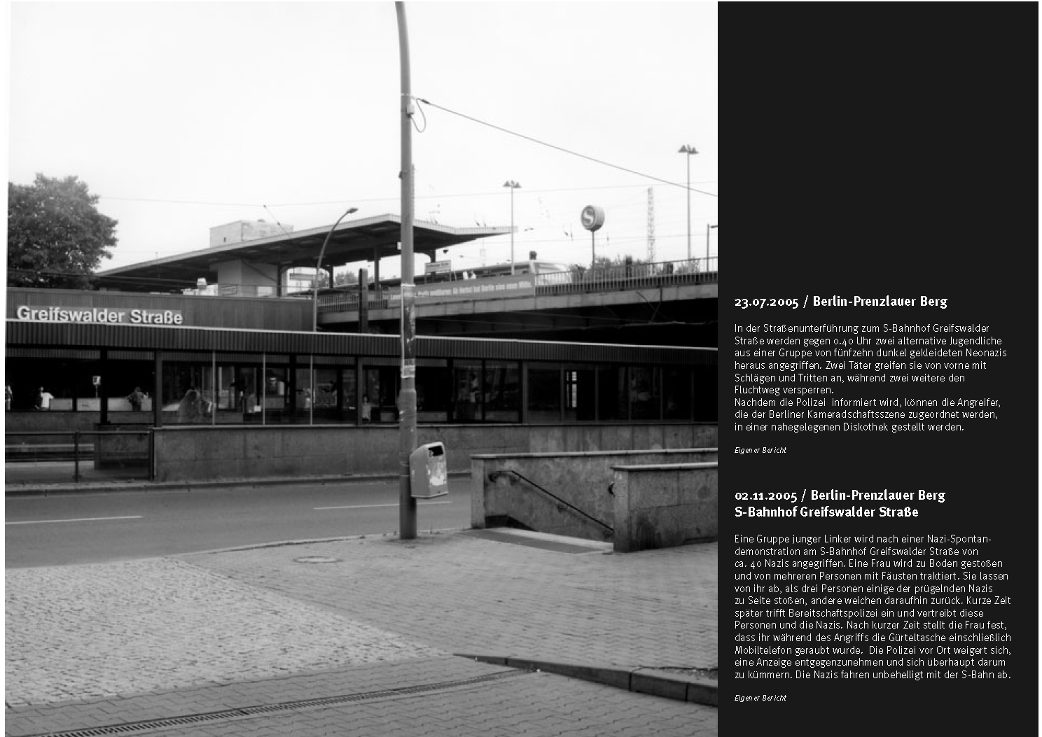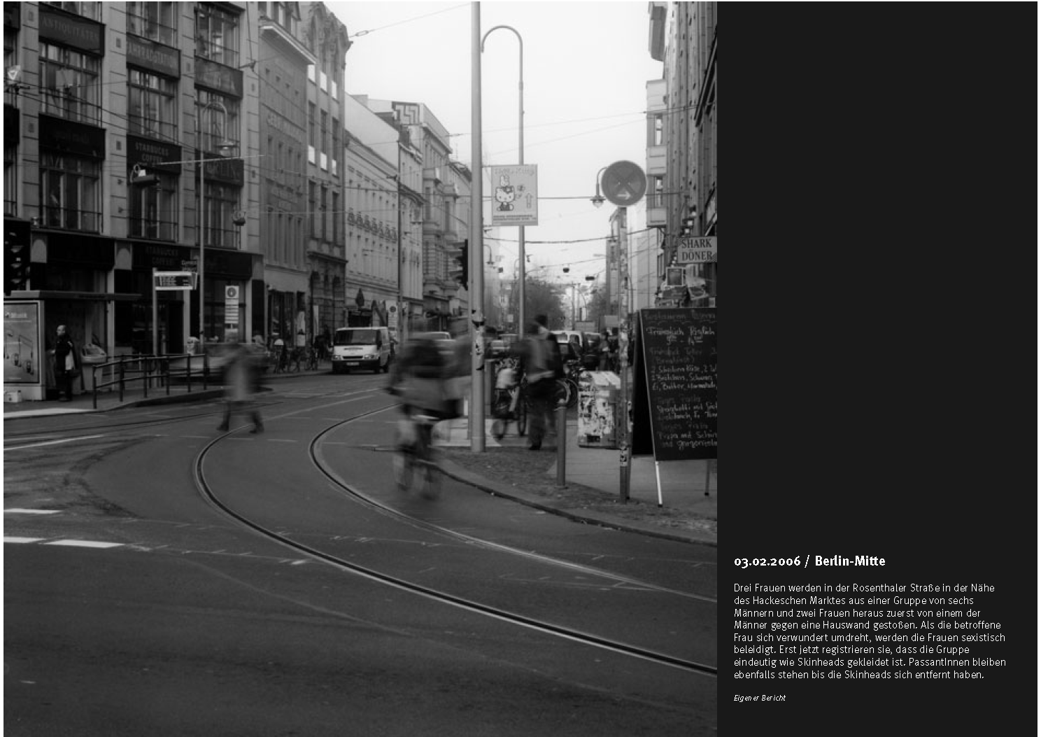 Die Ausstellung ist ein Appell, nicht wegzuschauen, sich einzumischen und Hilfe zu holen, wenn Andere bedroht und angegriffen werden – auch und gerade an den uns so vertrauten Orten, an denen Vielen das Recht abgesprochen wird, sich dort - wie alle anderen auch - aufzuhalten und ihren Alltag zu leben.