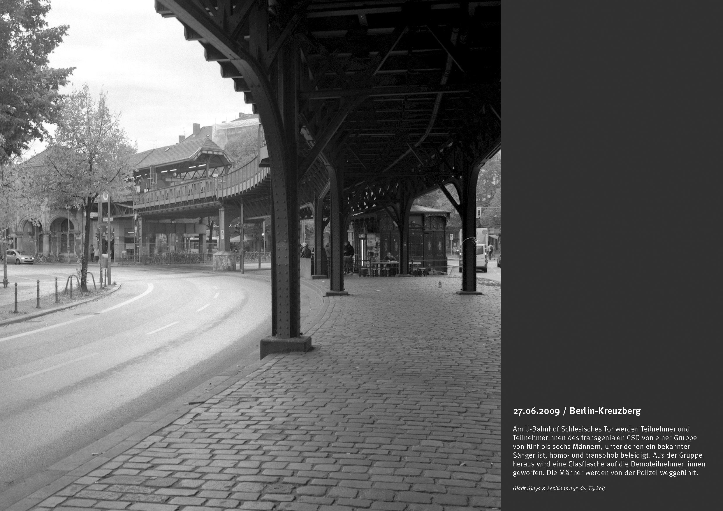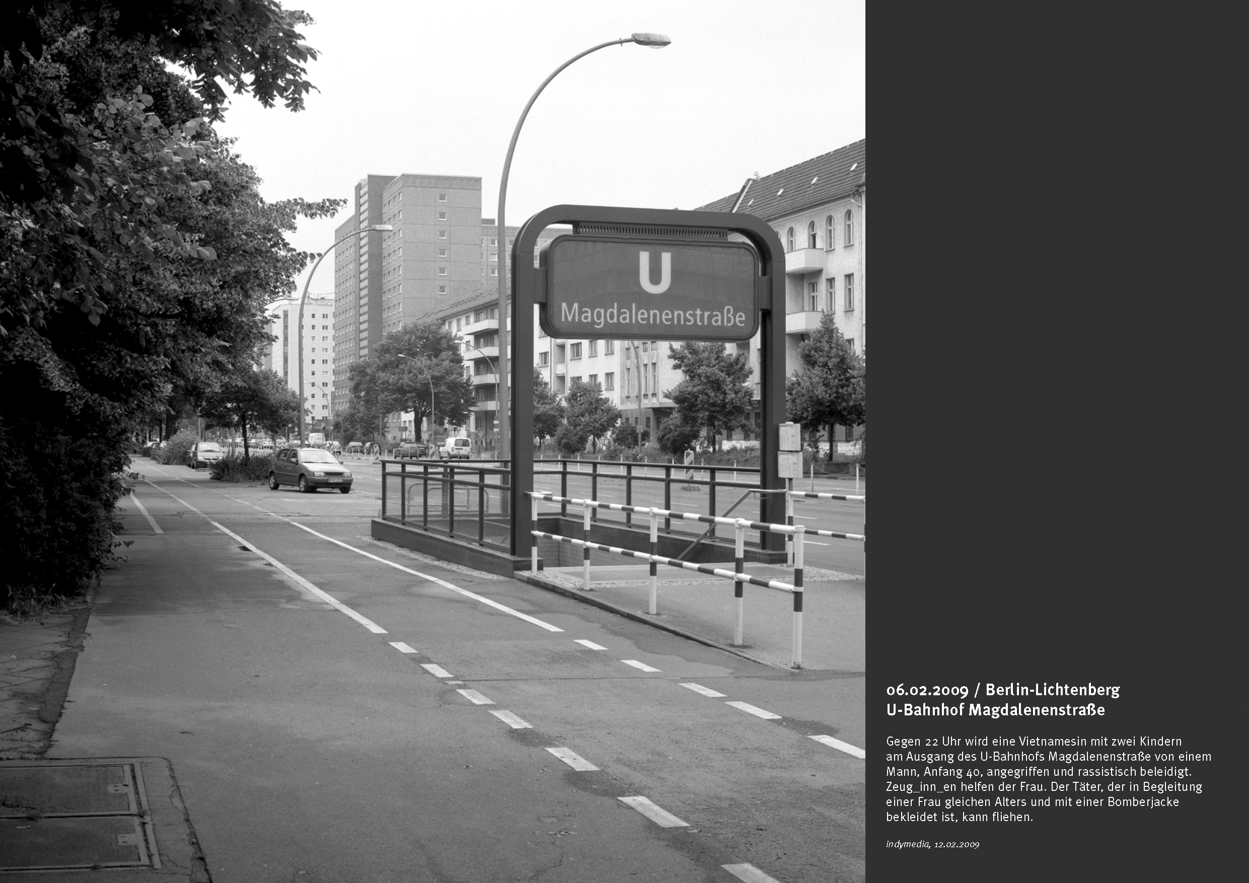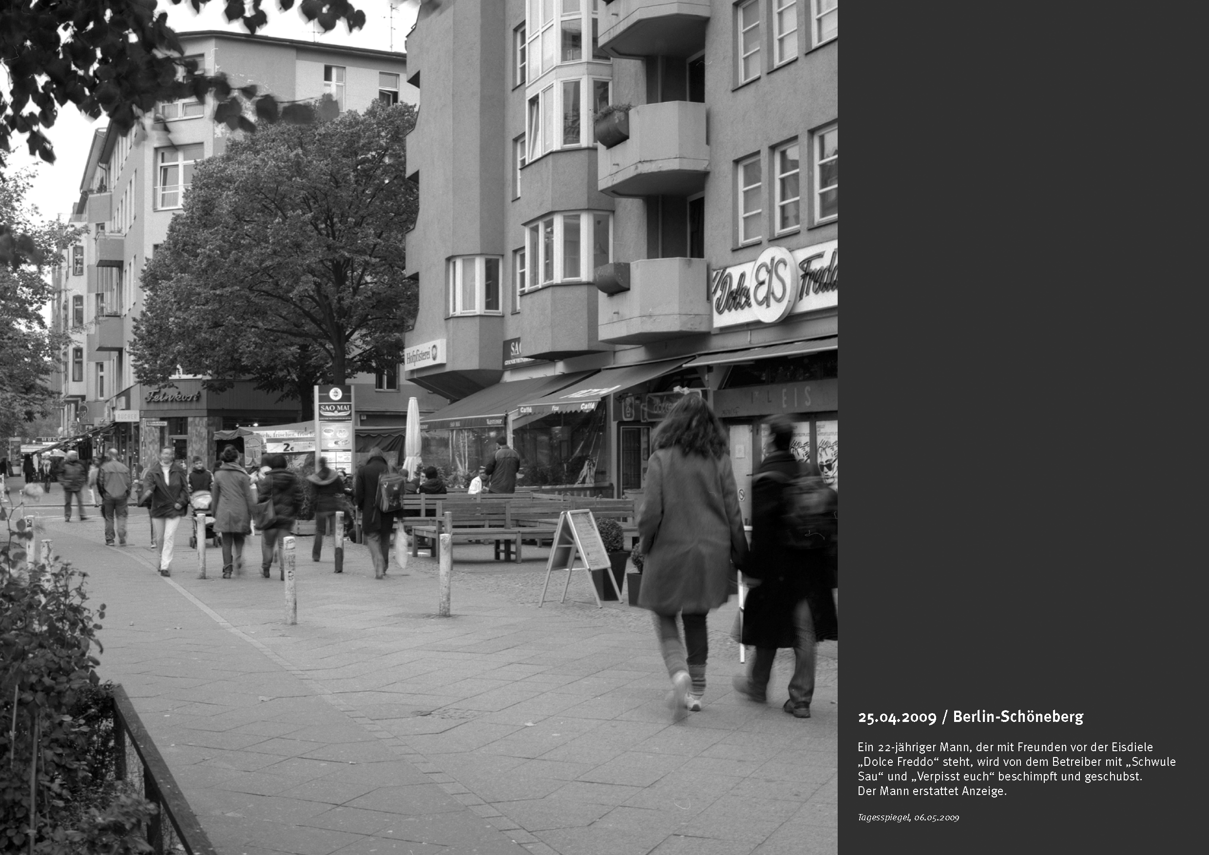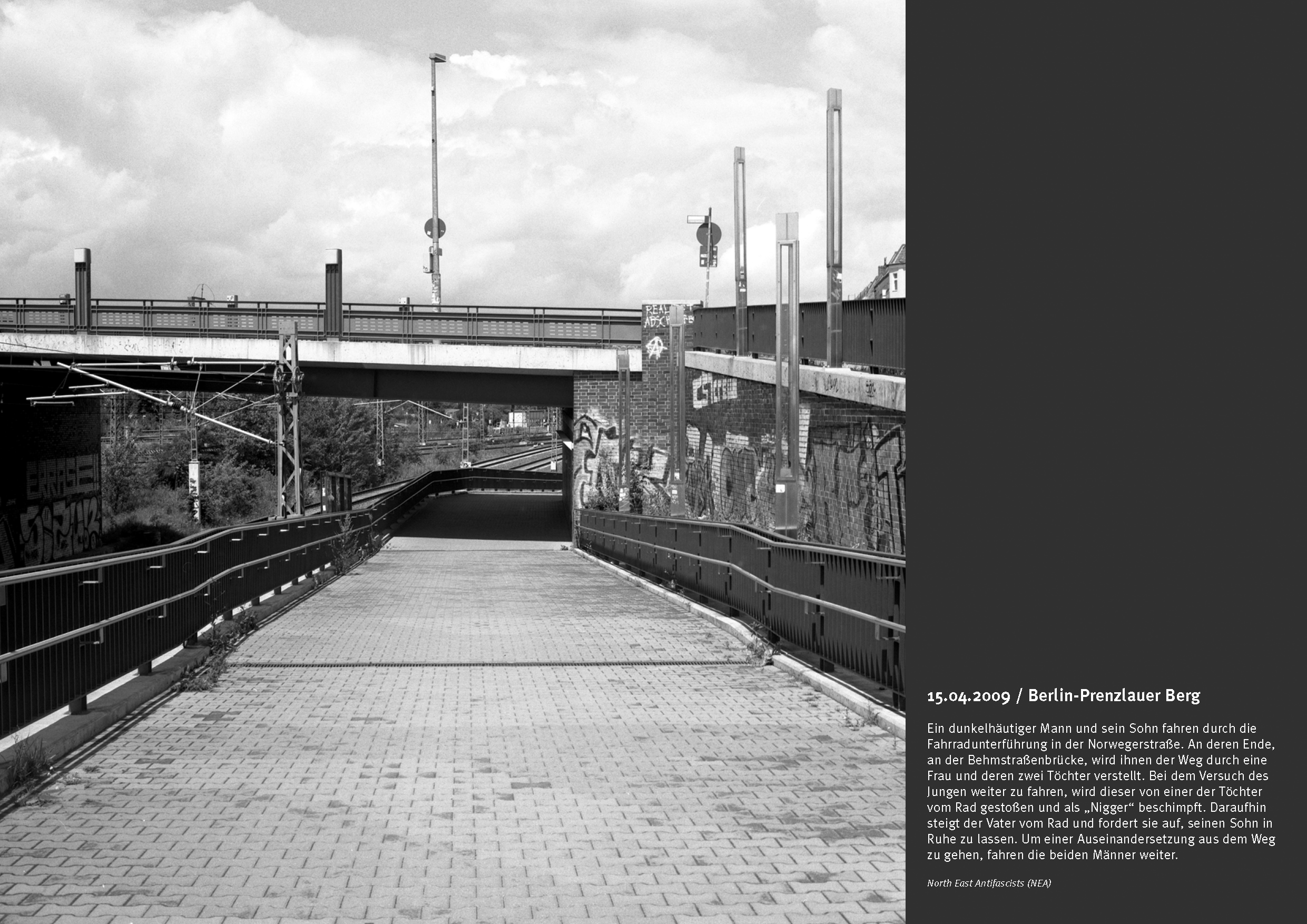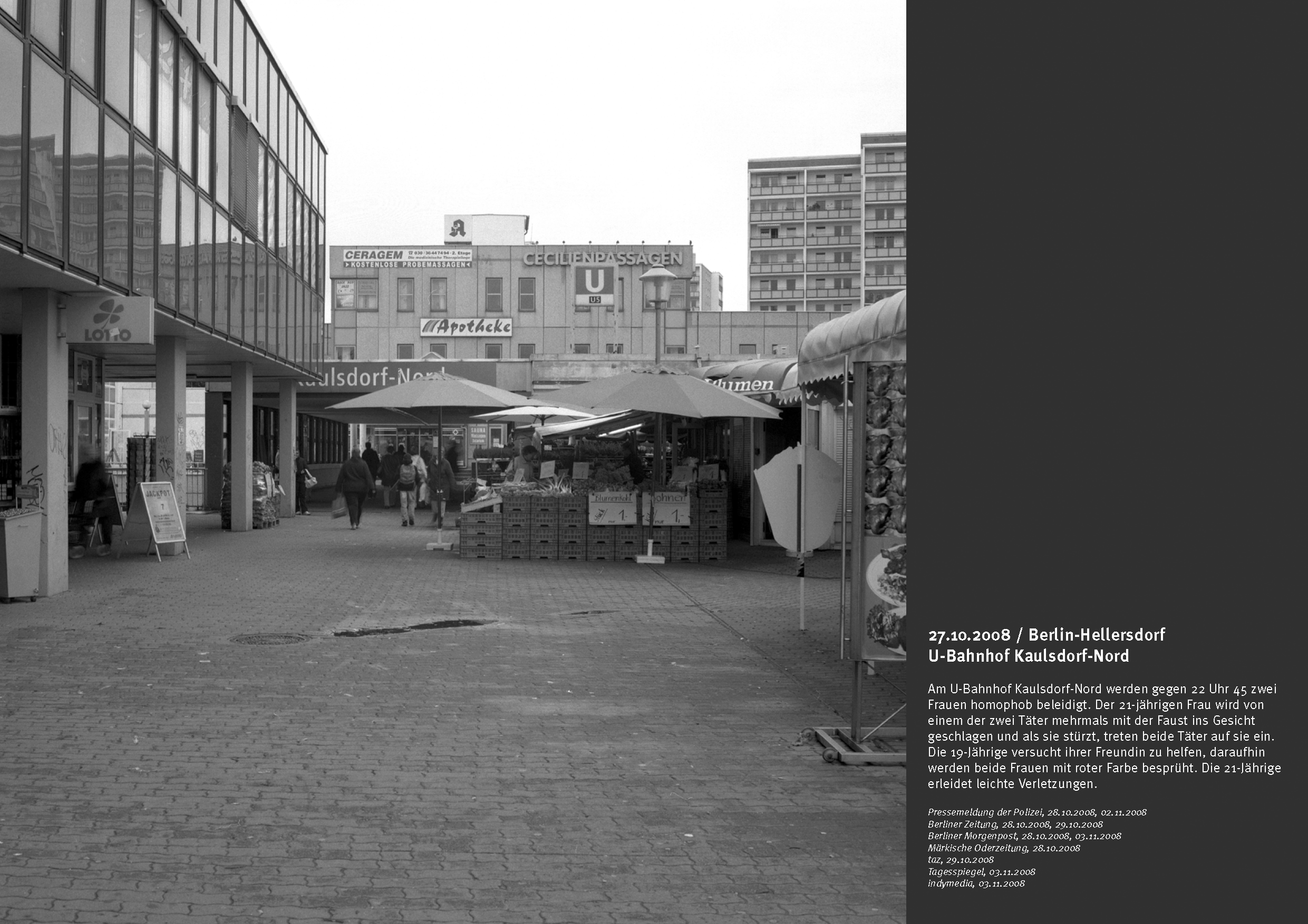 Die Ausstellung ist ein Appell, nicht wegzuschauen, sich einzumischen und Hilfe zu holen, wenn Andere bedroht und angegriffen werden – auch und gerade an den uns so vertrauten Orten, an denen Vielen das Recht abgesprochen wird, sich dort - wie alle anderen auch - aufzuhalten und ihren Alltag zu leben.