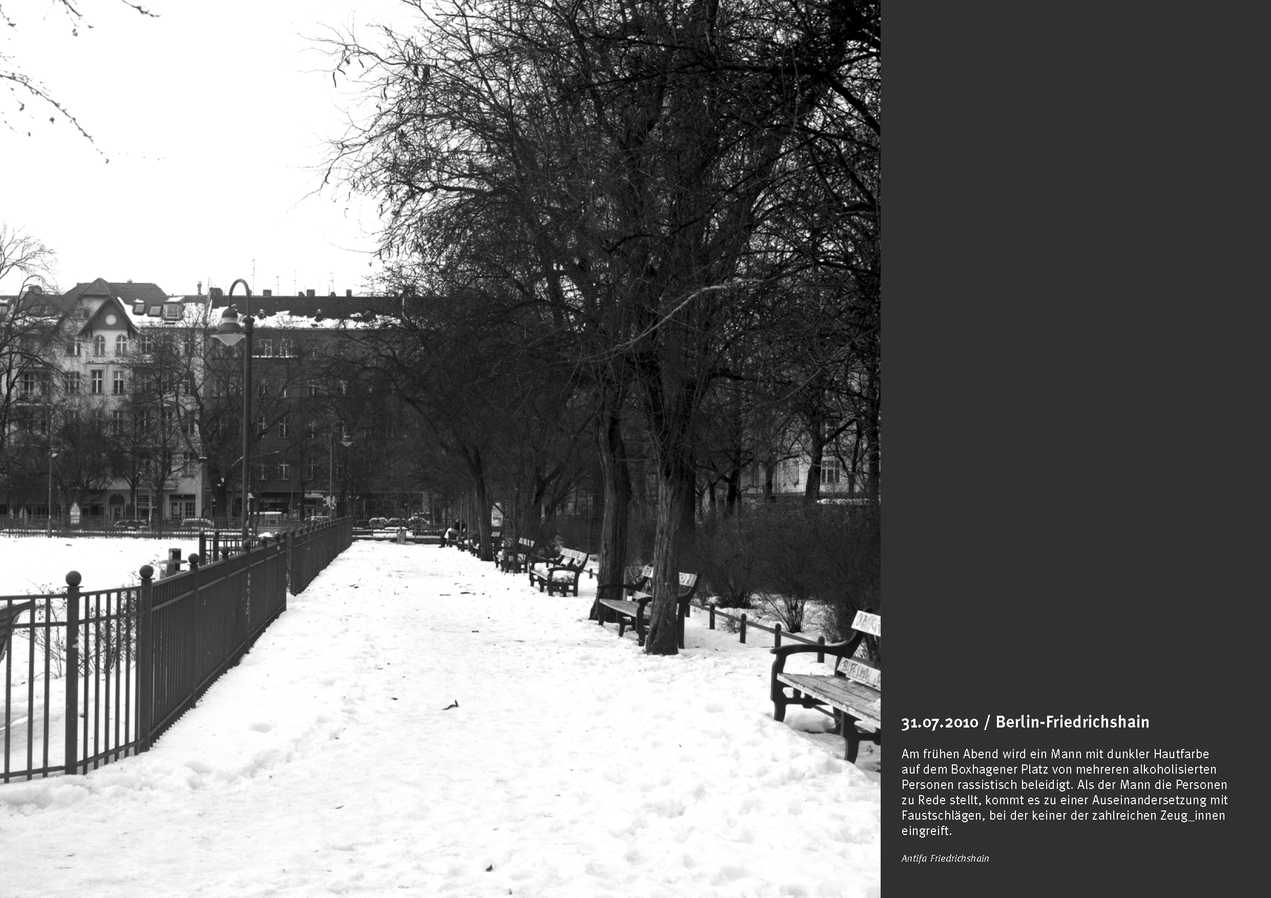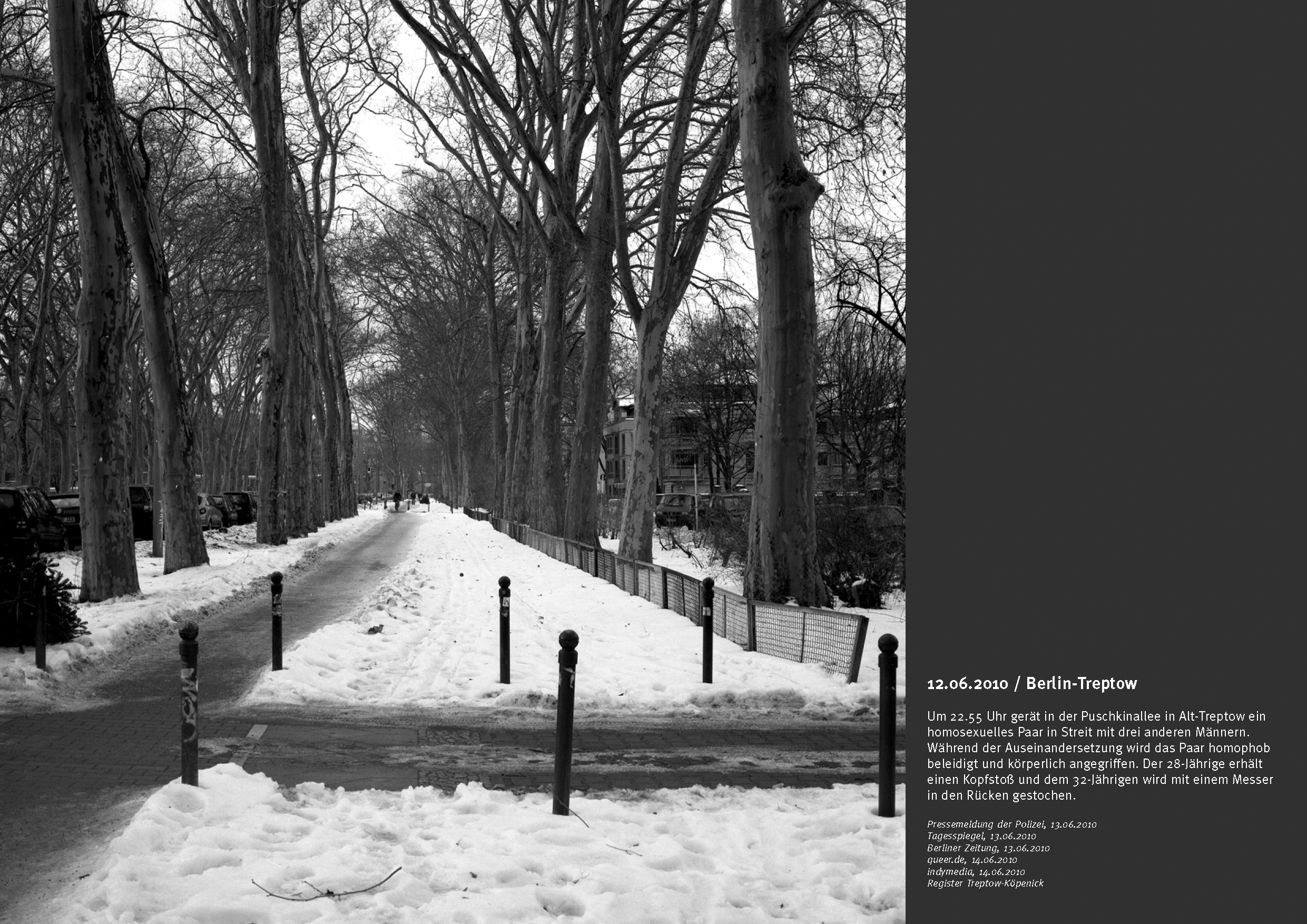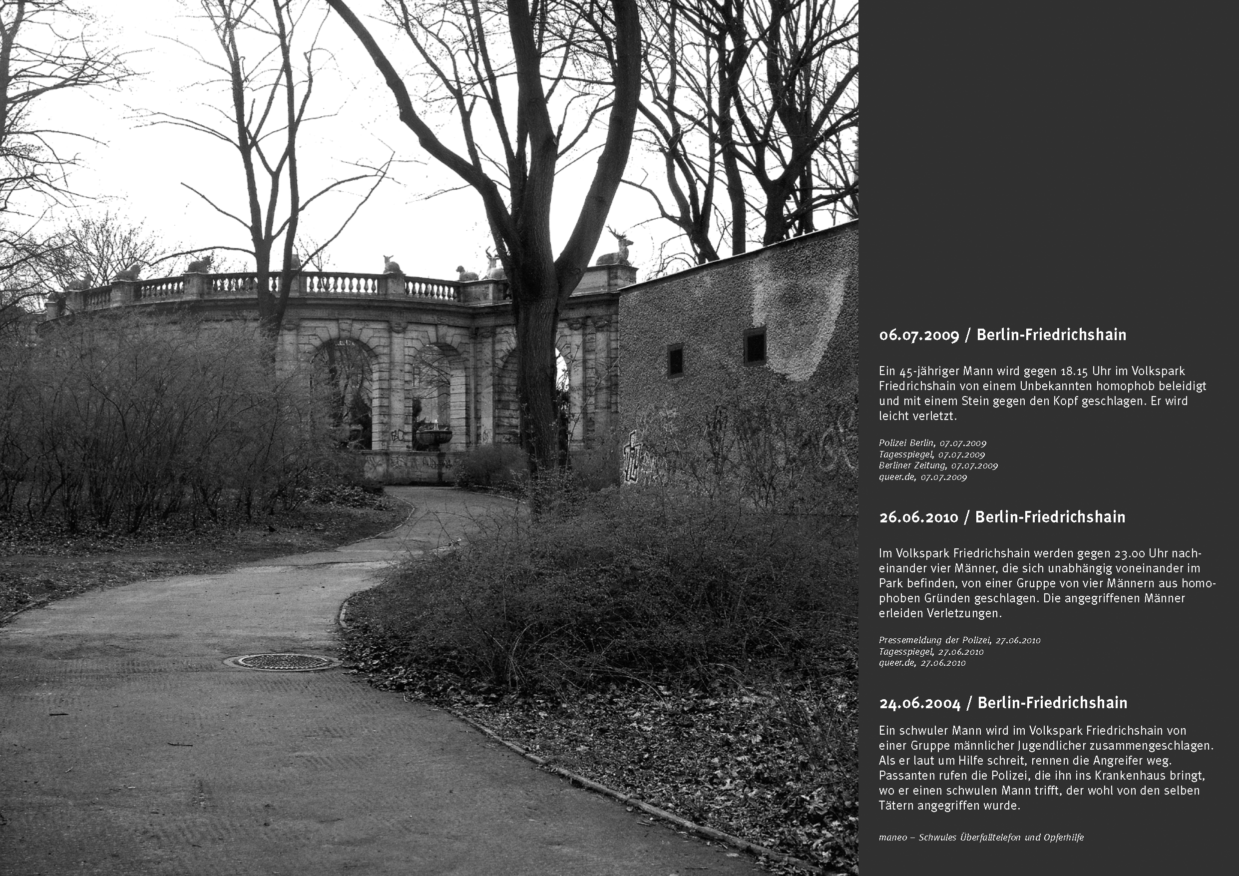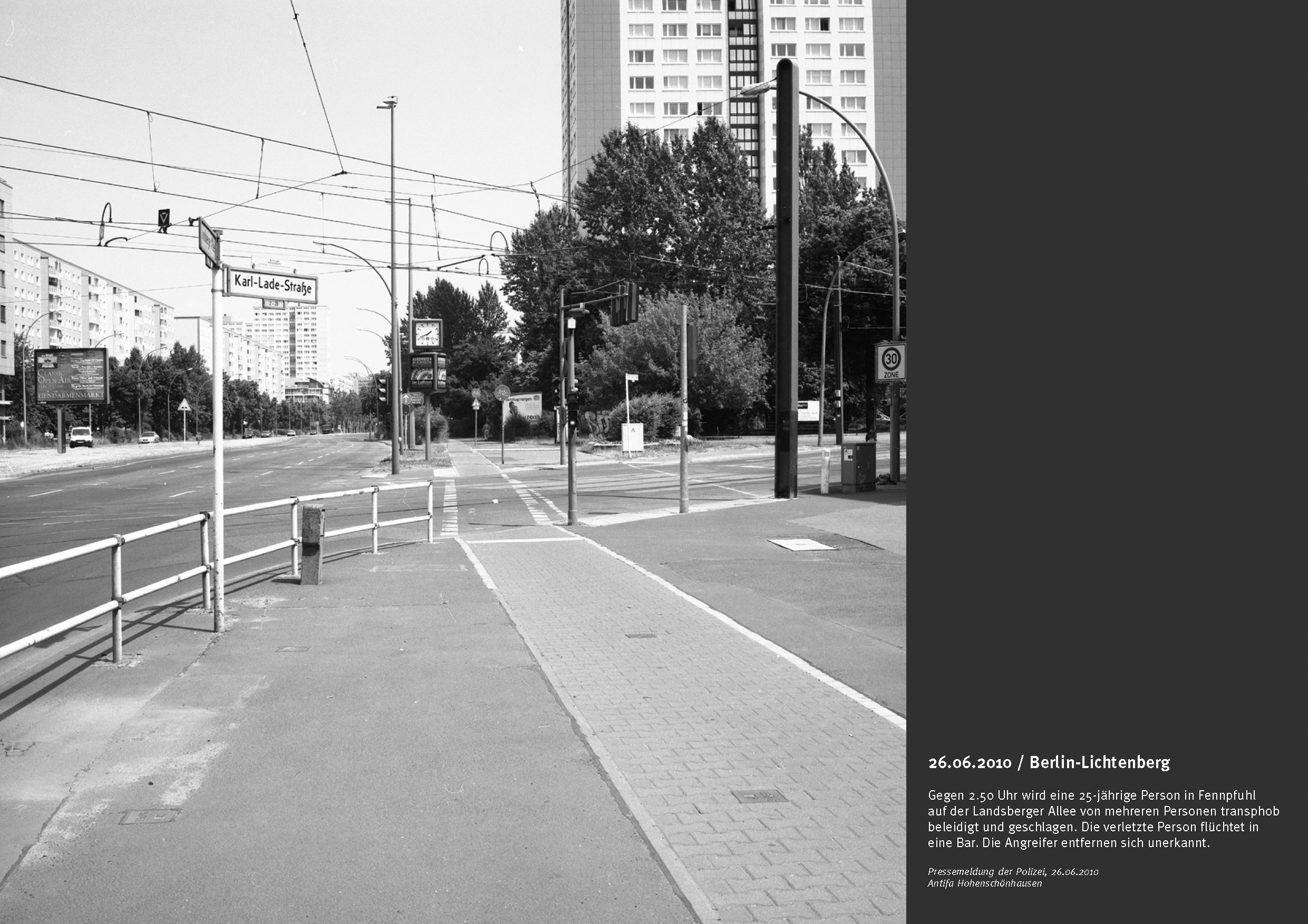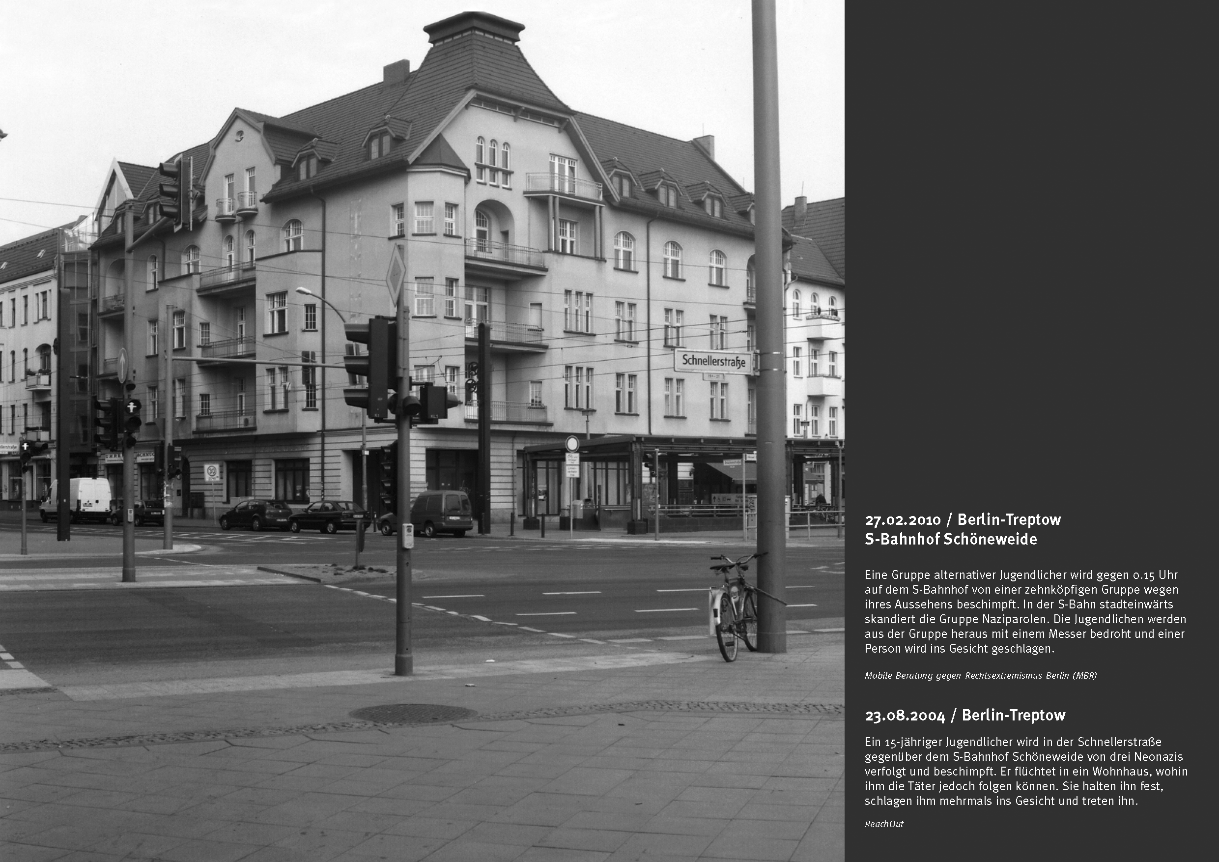 Die Ausstellung ist ein Appell, nicht wegzuschauen, sich einzumischen und Hilfe zu holen, wenn Andere bedroht und angegriffen werden – auch und gerade an den uns so vertrauten Orten, an denen Vielen das Recht abgesprochen wird, sich dort - wie alle anderen auch - aufzuhalten und ihren Alltag zu leben.