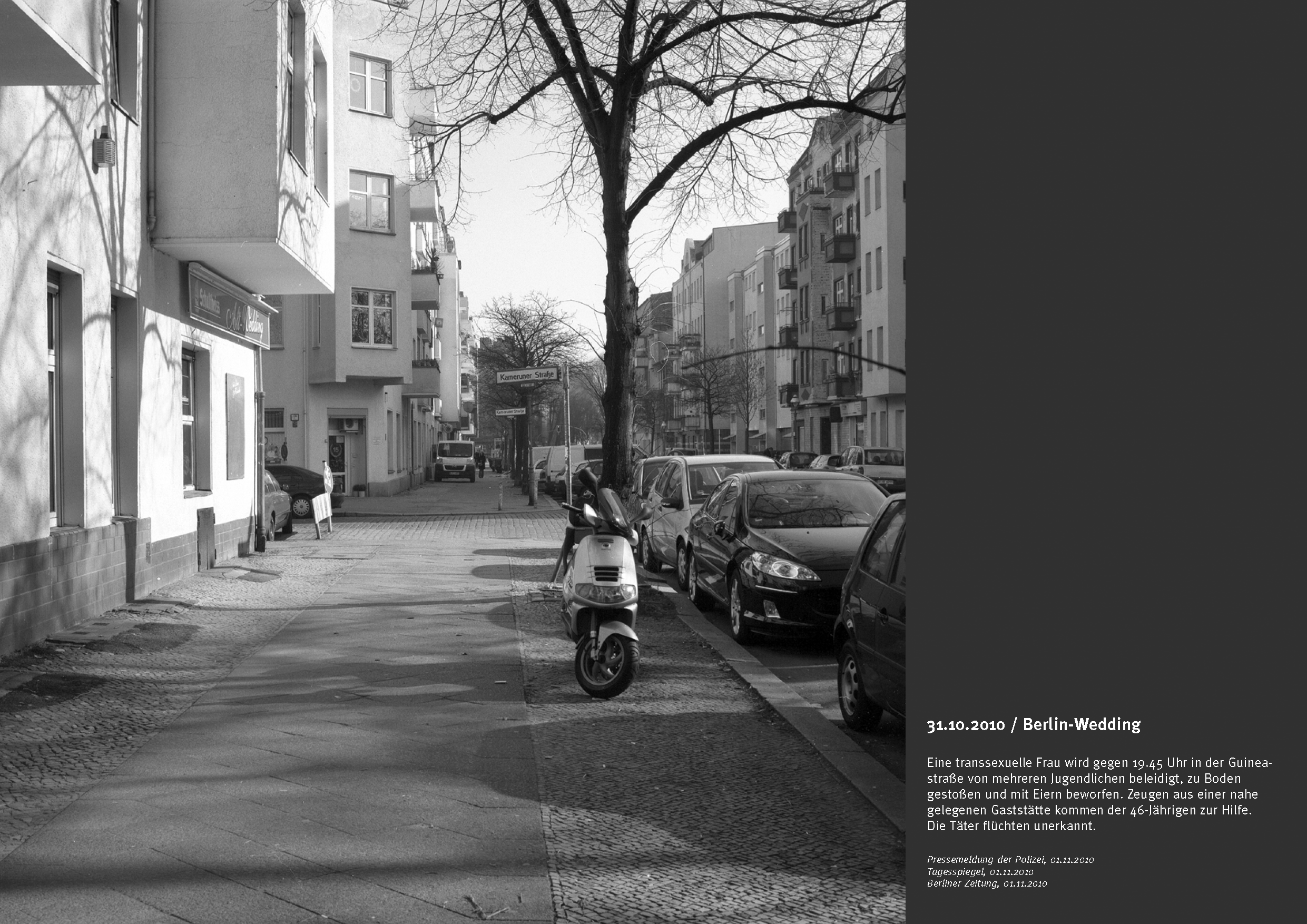 Die Fotos der Tatorte lassen nicht die Angst und die Schmerzen der Opfer erkennen, ebenso wenig wie einen konkreten Tathergang. Gegenübergestellt mit den Meldungen aus der Chronik entsteht das mögliche Szenario ausschließlich in der Phantasie der BetrachterInnen. Für die einen sind es ganz normale Orte - für die anderen Orte eines Traumas.