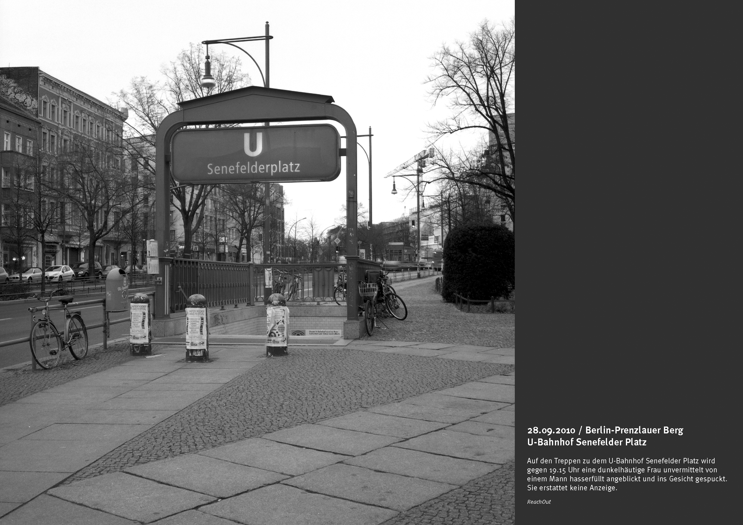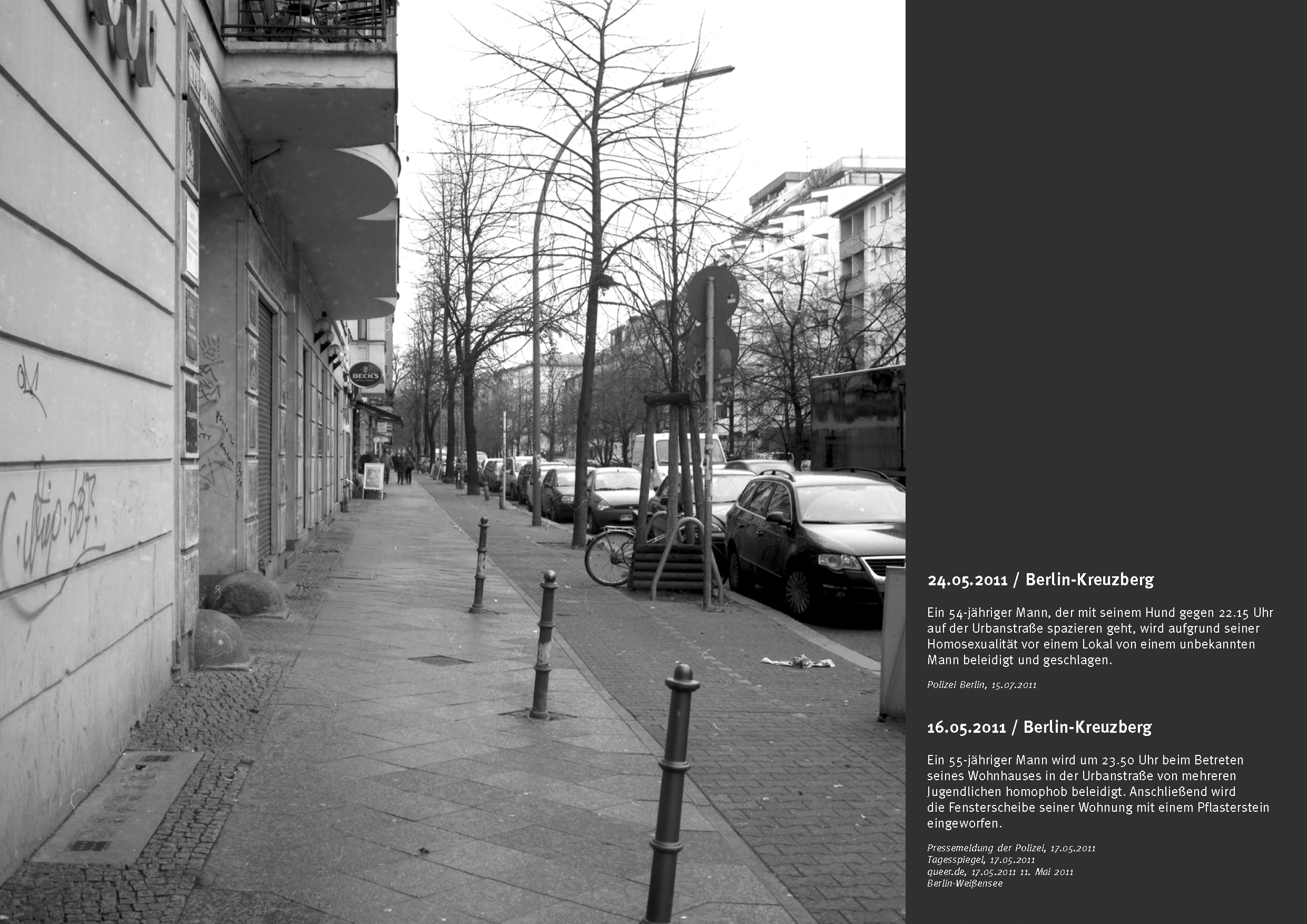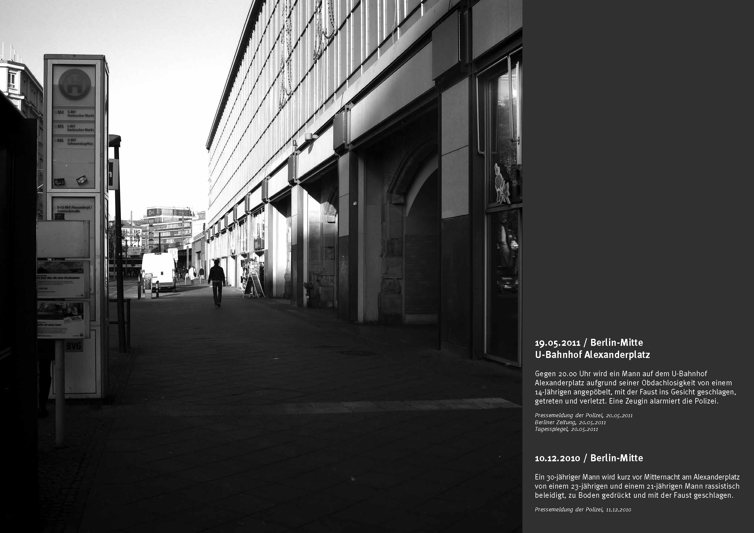 Die Ausstellung ist ein Appell, nicht wegzuschauen, sich einzumischen und Hilfe zu holen, wenn Andere bedroht und angegriffen werden – auch und gerade an den uns so vertrauten Orten, an denen Vielen das Recht abgesprochen wird, sich dort - wie alle anderen auch - aufzuhalten und ihren Alltag zu leben.