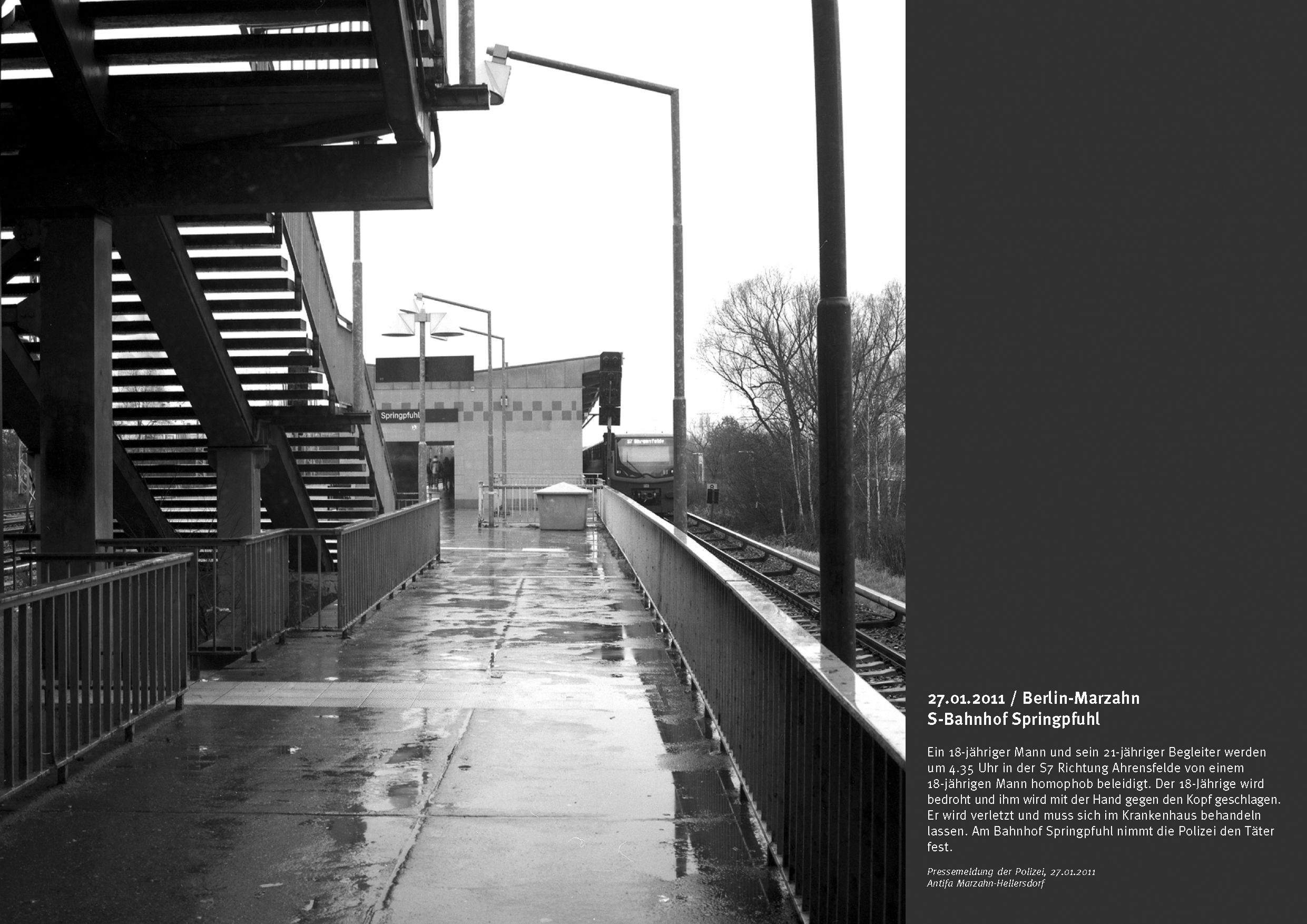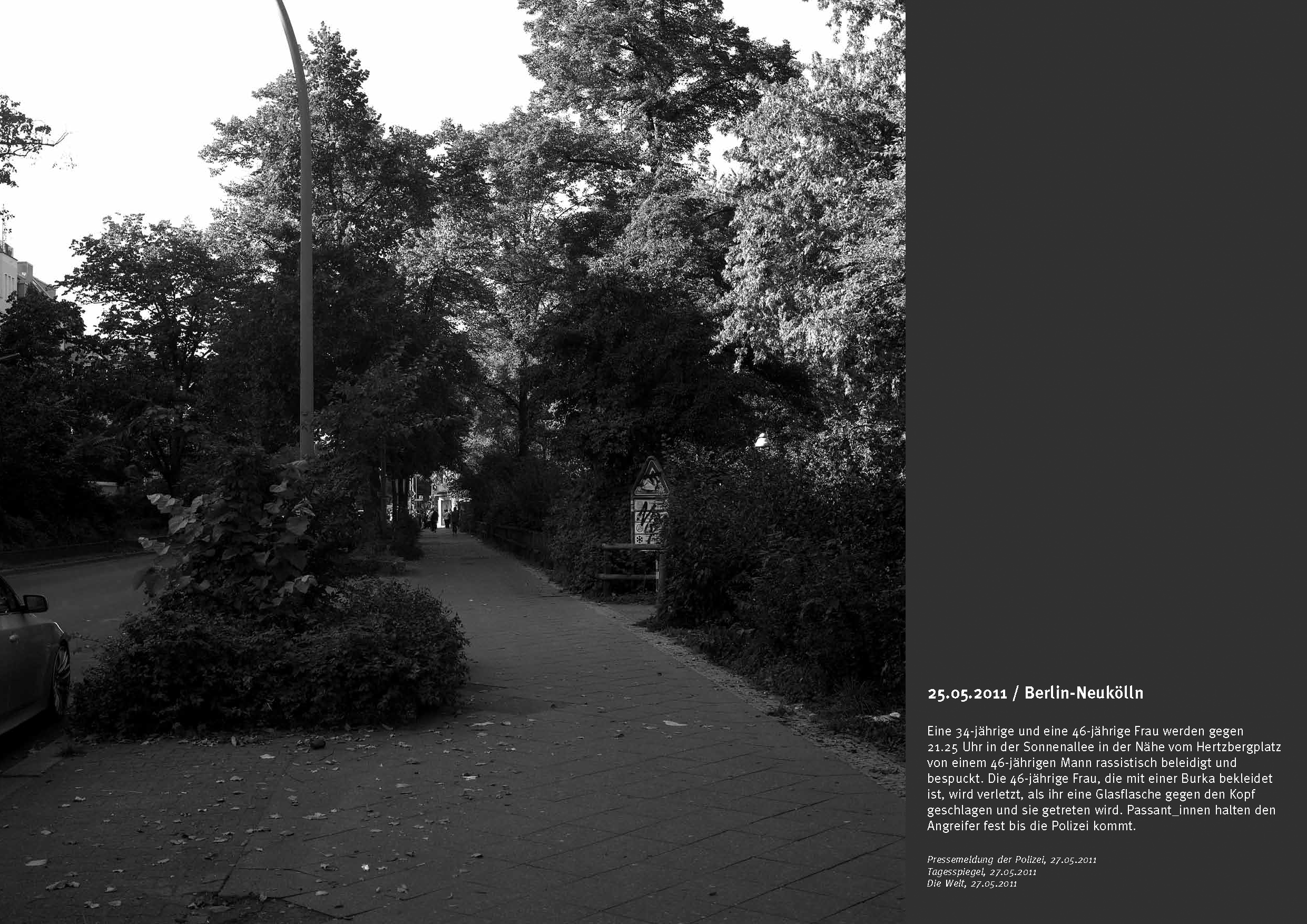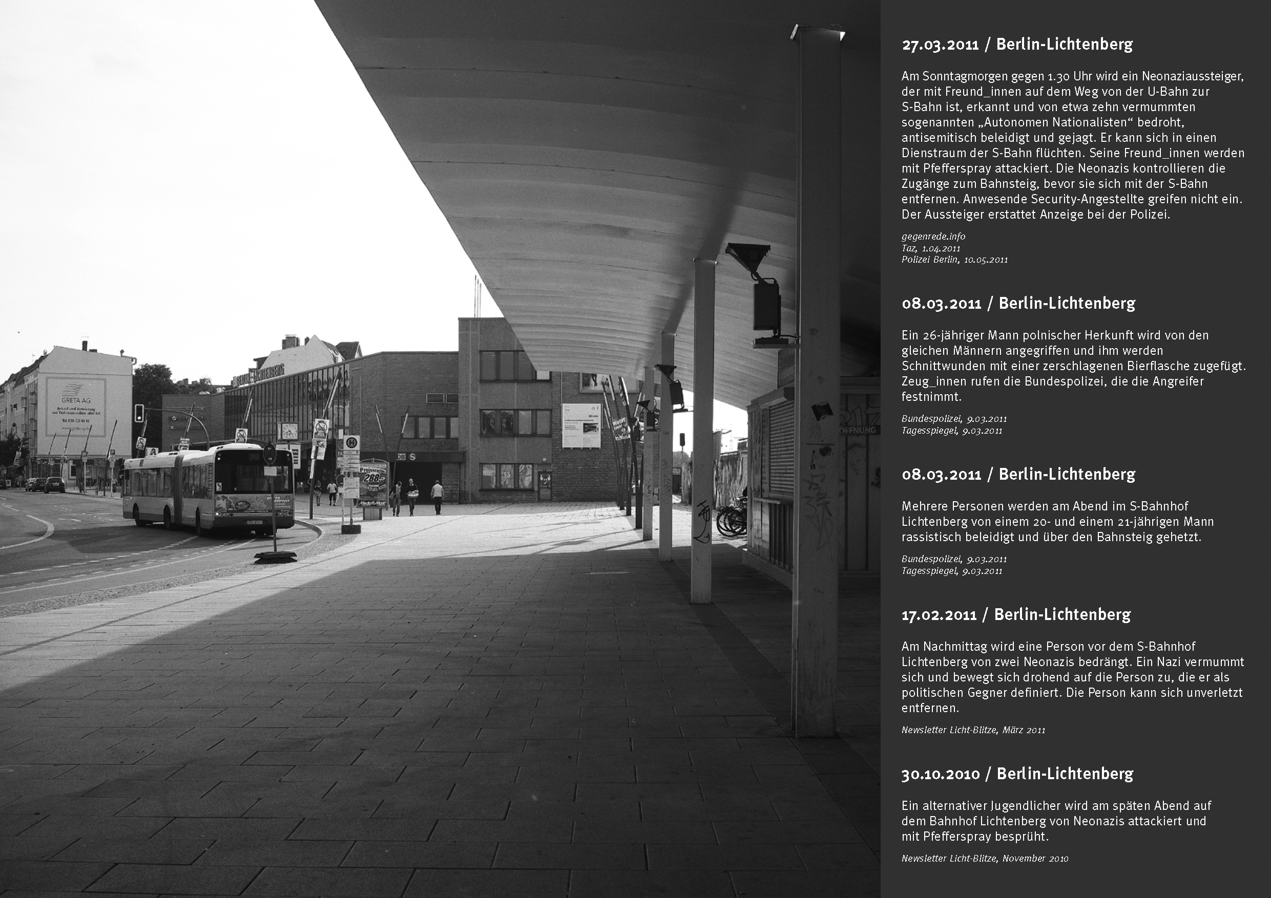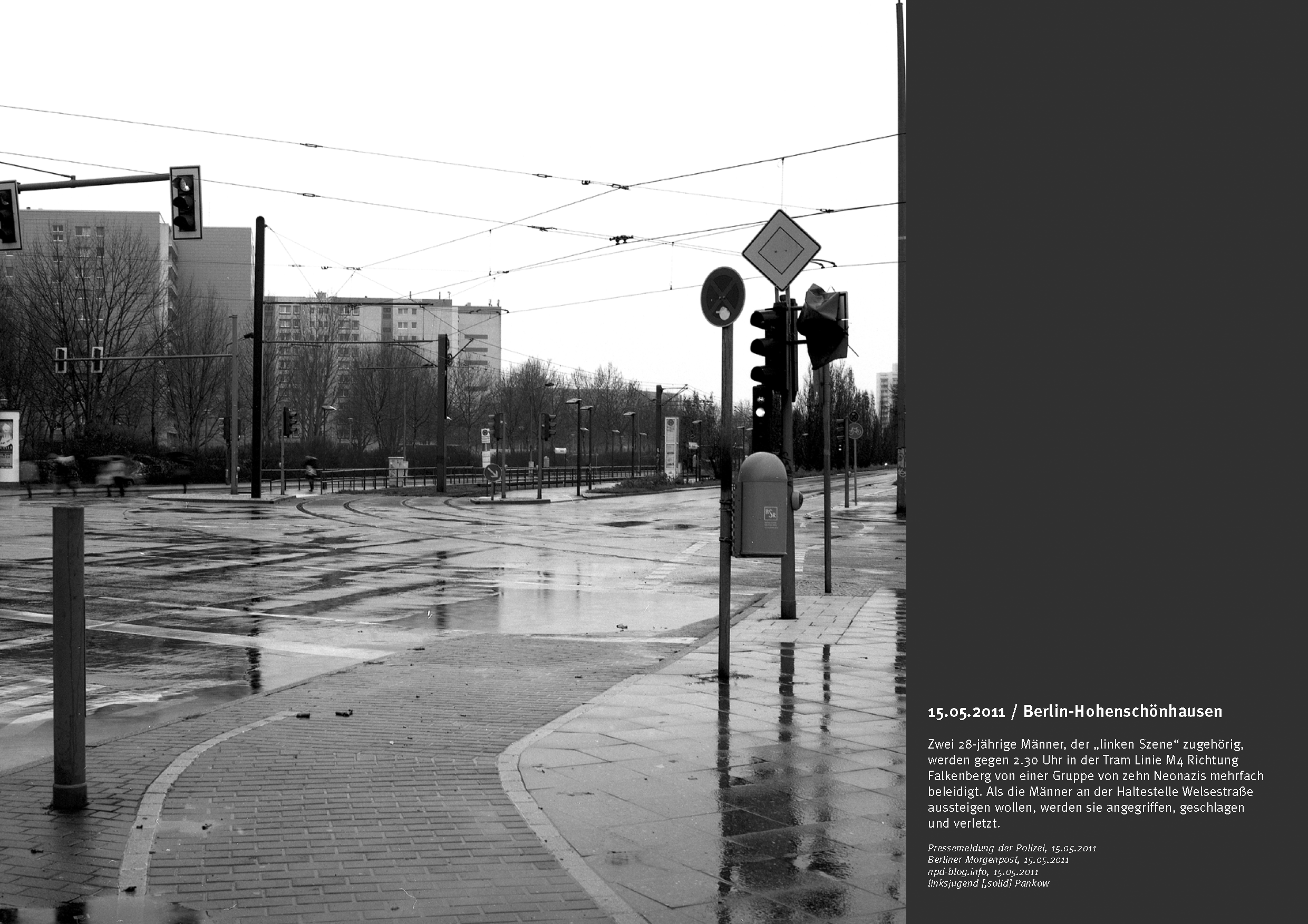 Die Ausstellung ist ein Appell, nicht wegzuschauen, sich einzumischen und Hilfe zu holen, wenn Andere bedroht und angegriffen werden – auch und gerade an den uns so vertrauten Orten, an denen Vielen das Recht abgesprochen wird, sich dort - wie alle anderen auch - aufzuhalten und ihren Alltag zu leben.