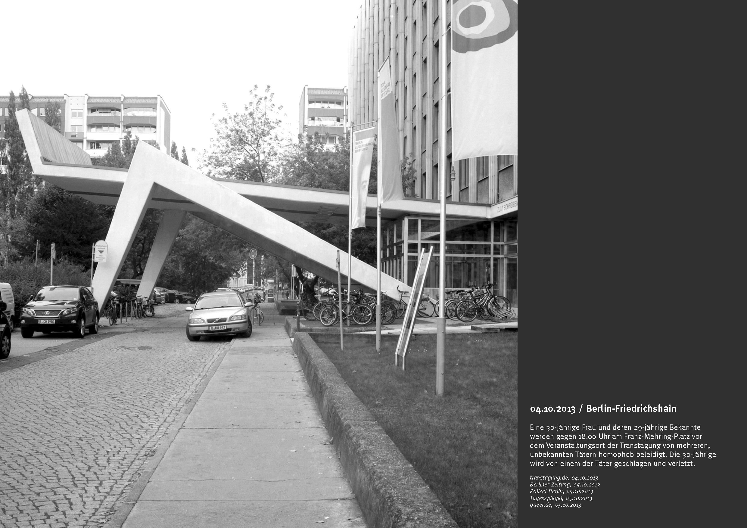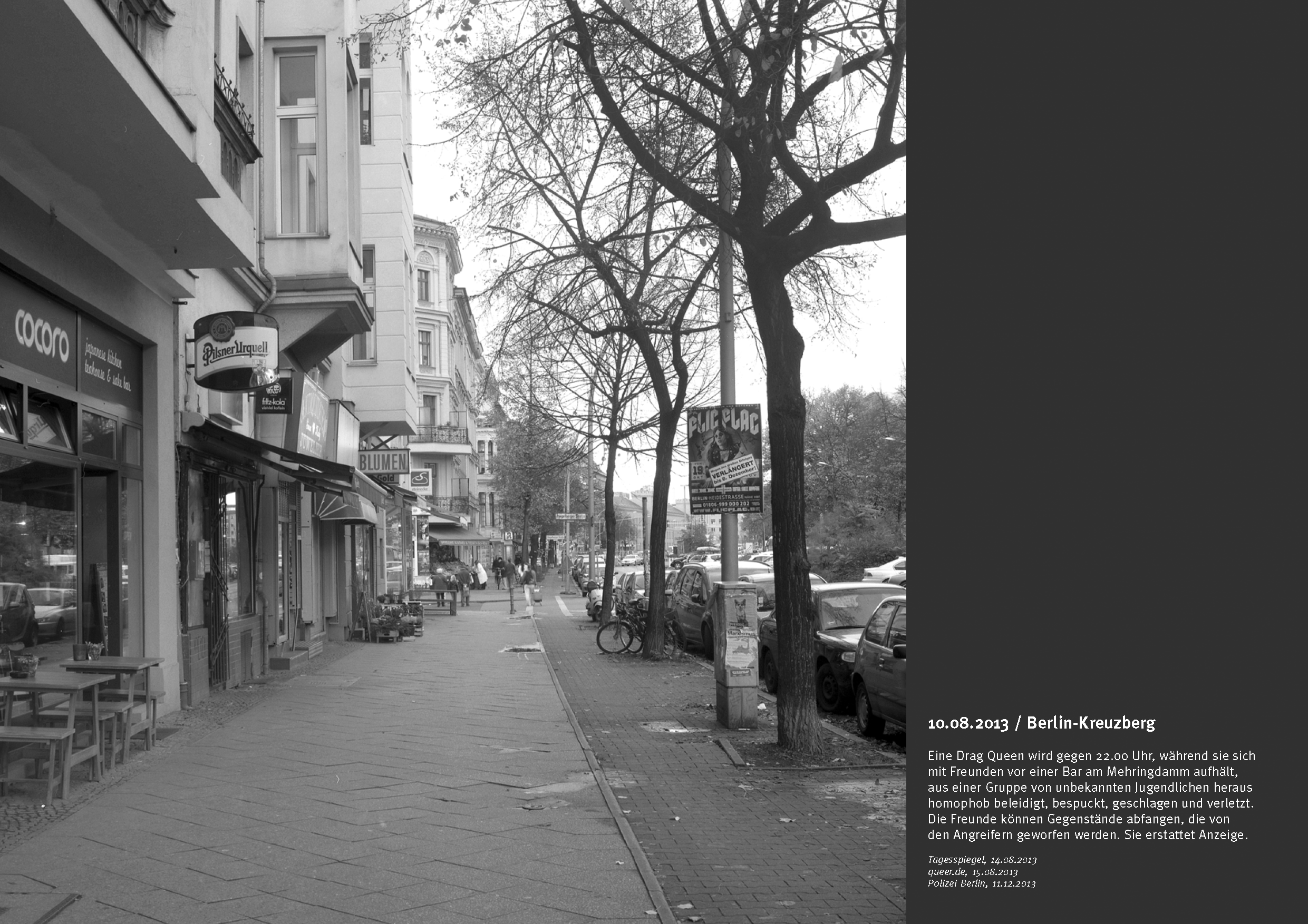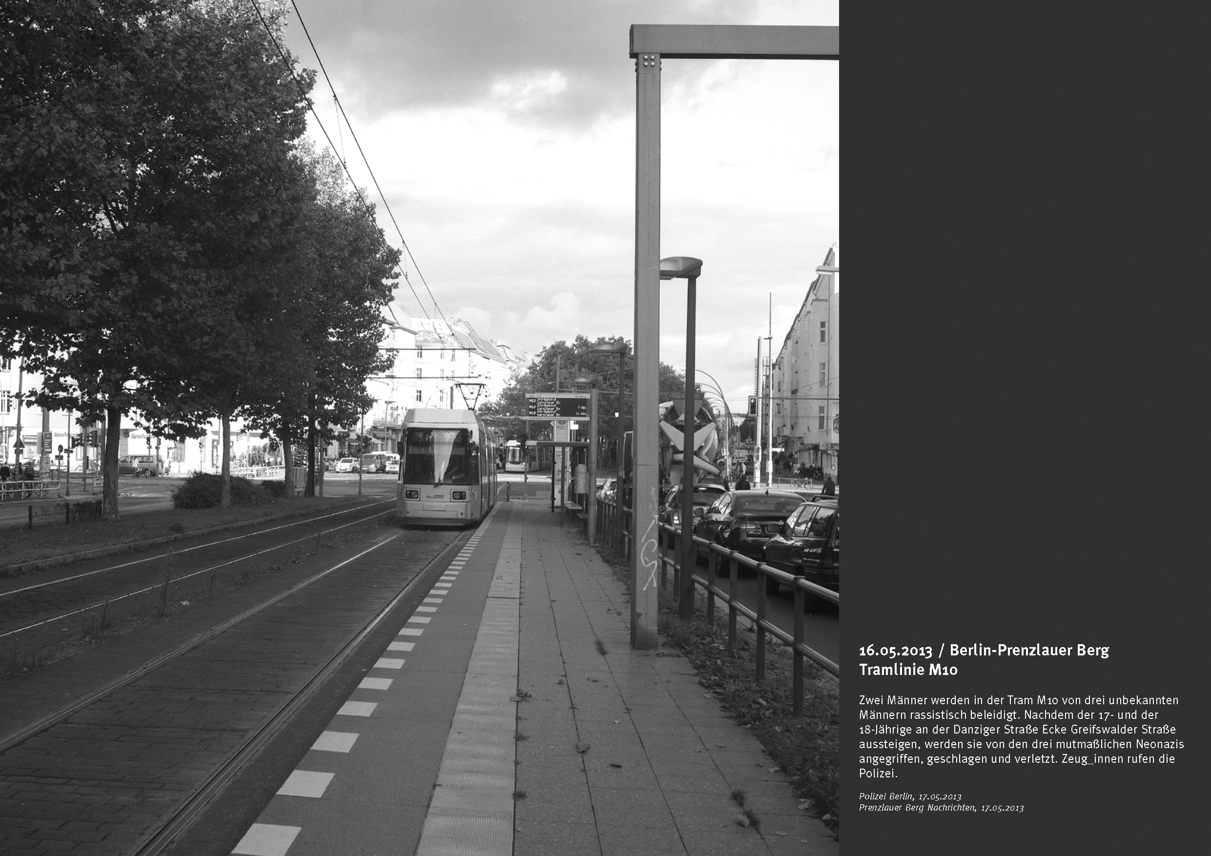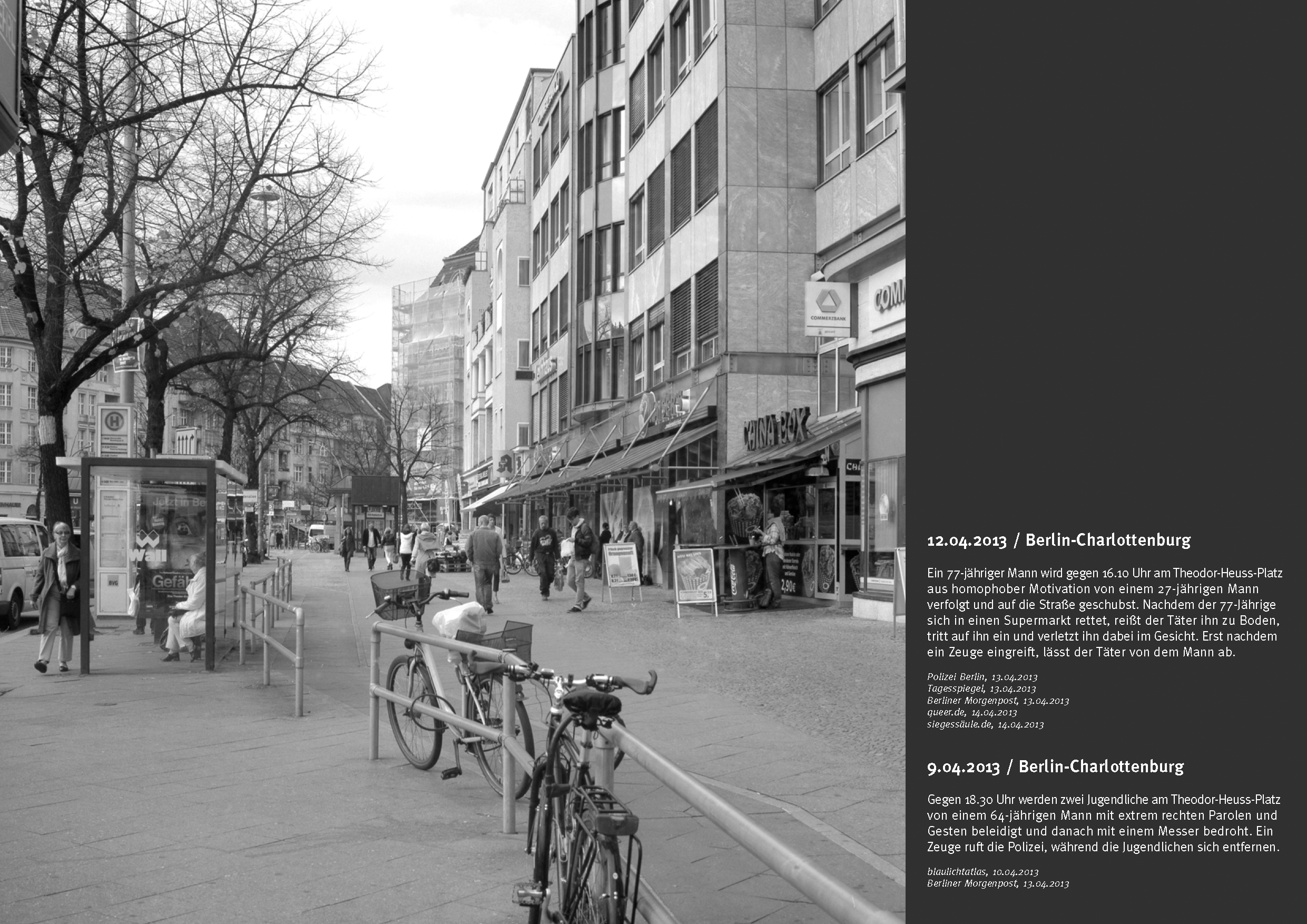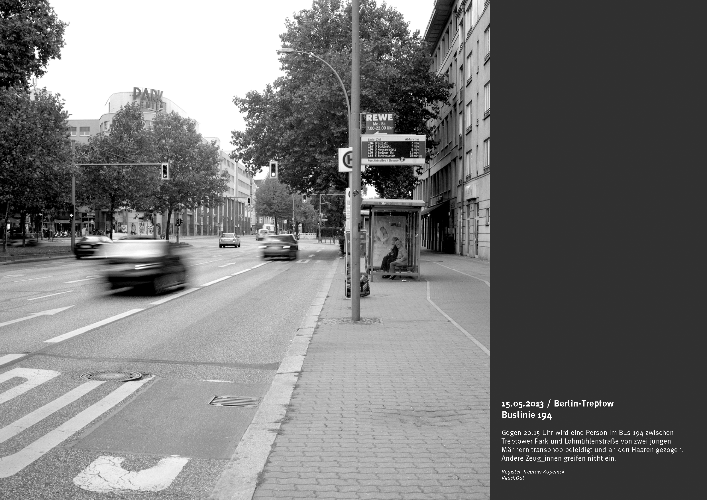 Die Ausstellung ist ein Appell, nicht wegzuschauen, sich einzumischen und Hilfe zu holen, wenn Andere bedroht und angegriffen werden – auch und gerade an den uns so vertrauten Orten, an denen Vielen das Recht abgesprochen wird, sich dort - wie alle anderen auch - aufzuhalten und ihren Alltag zu leben.