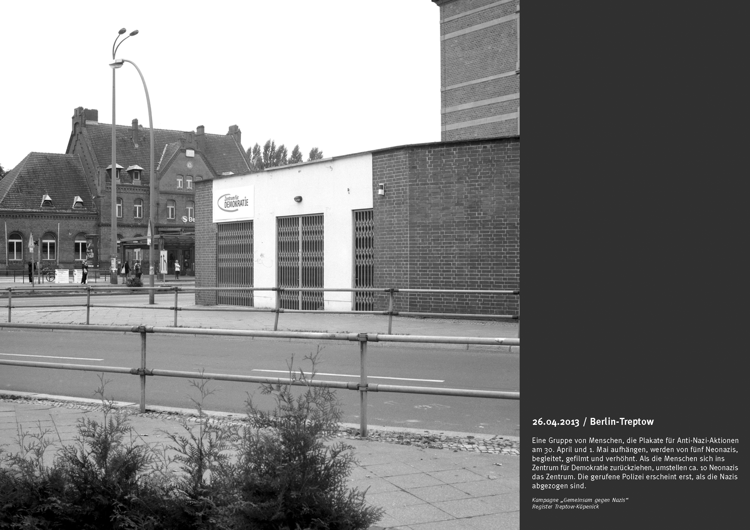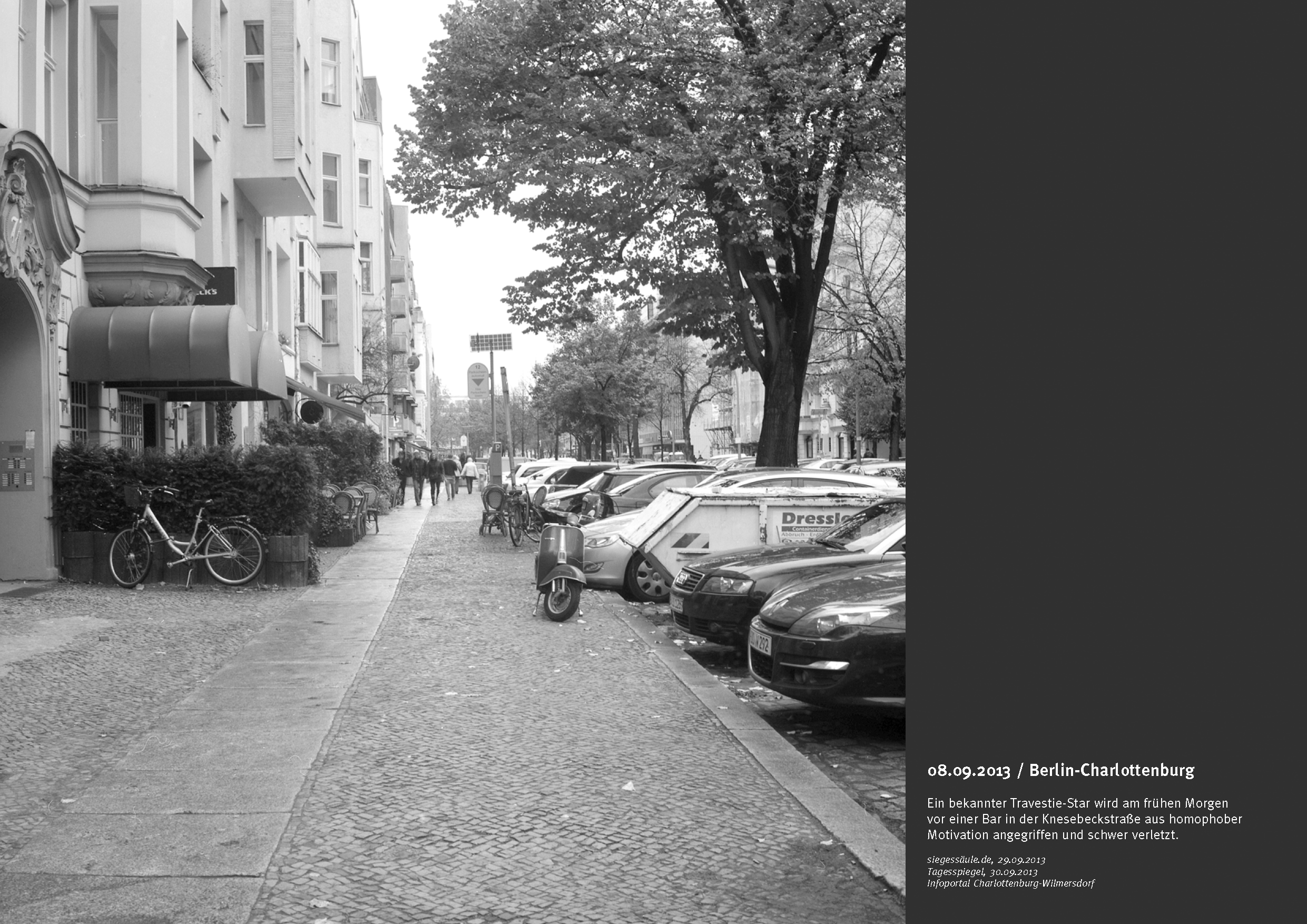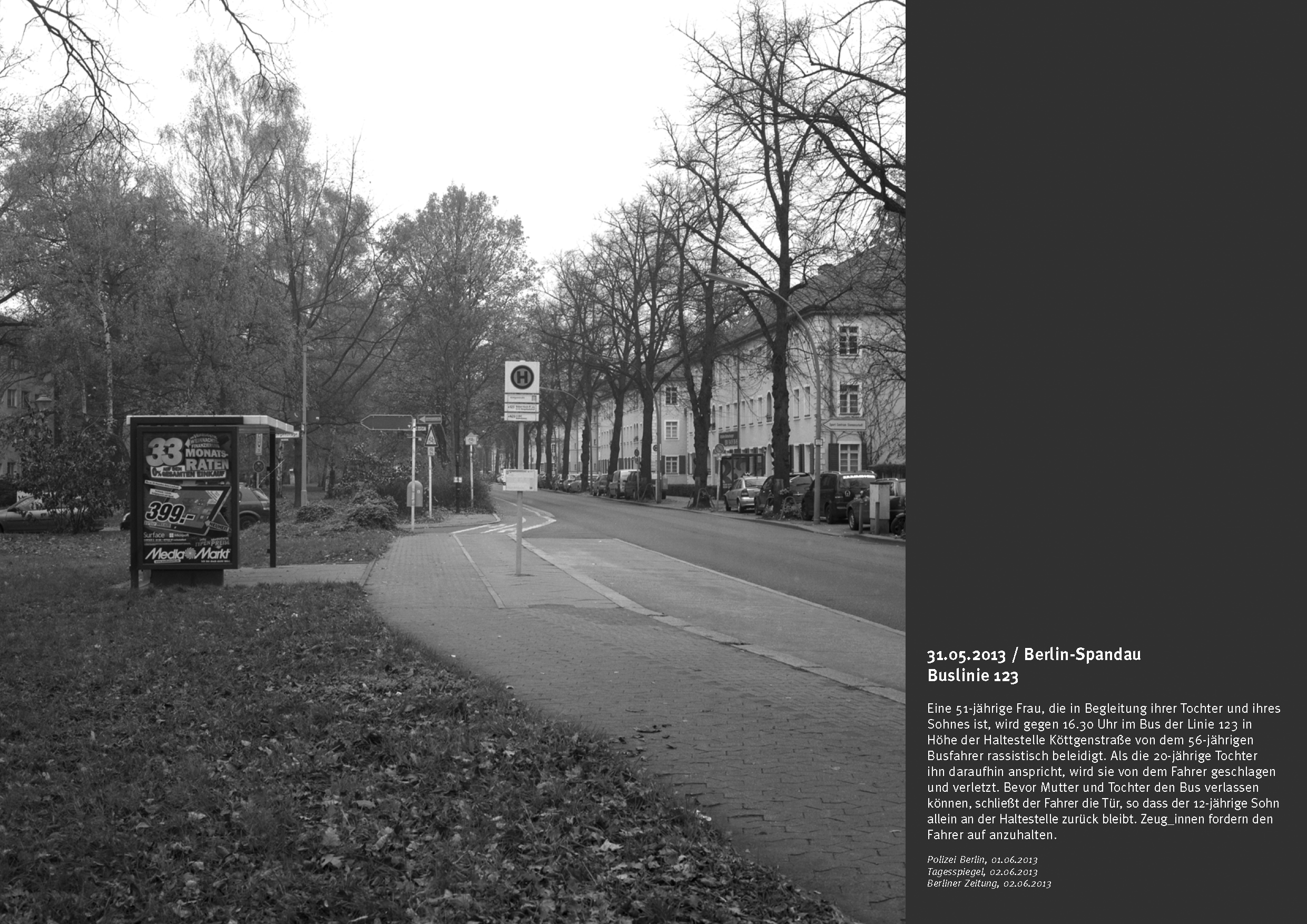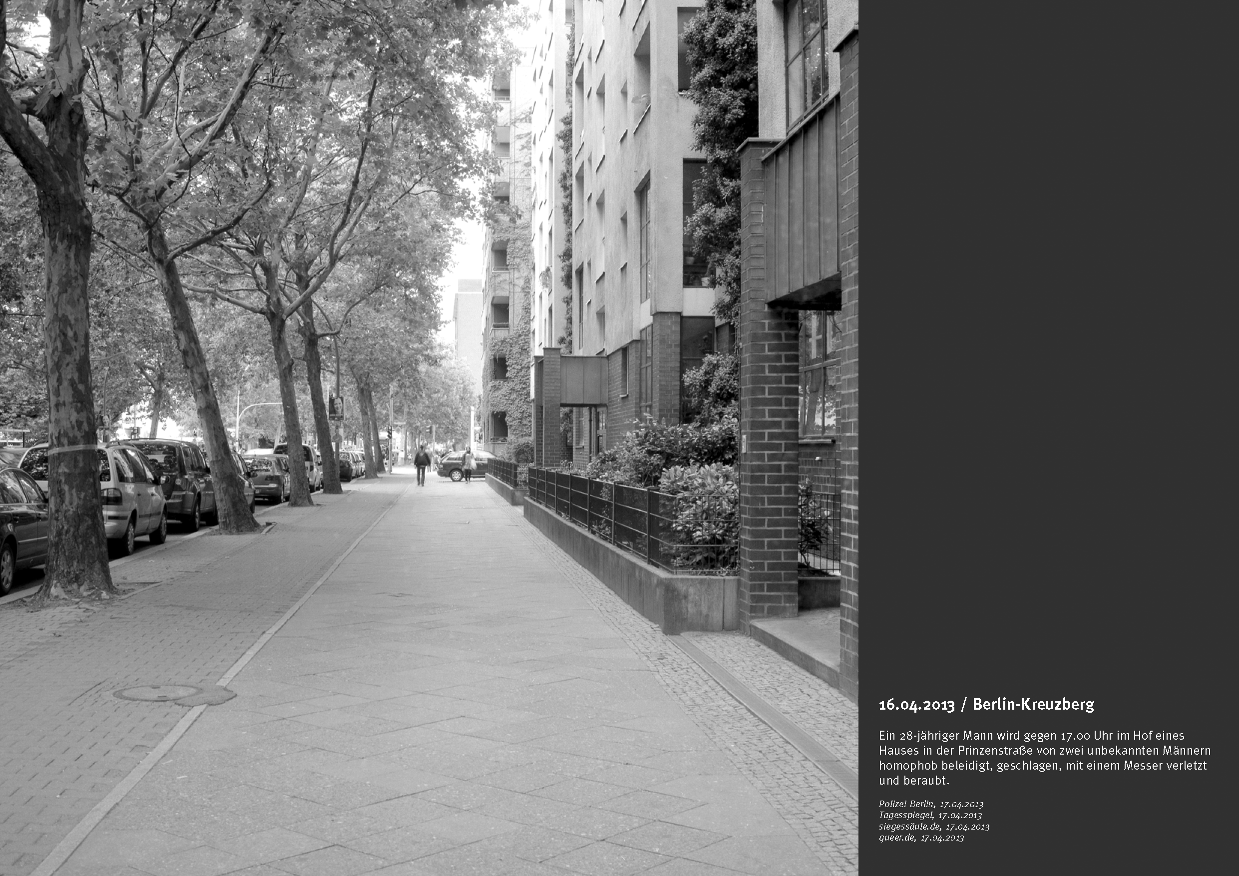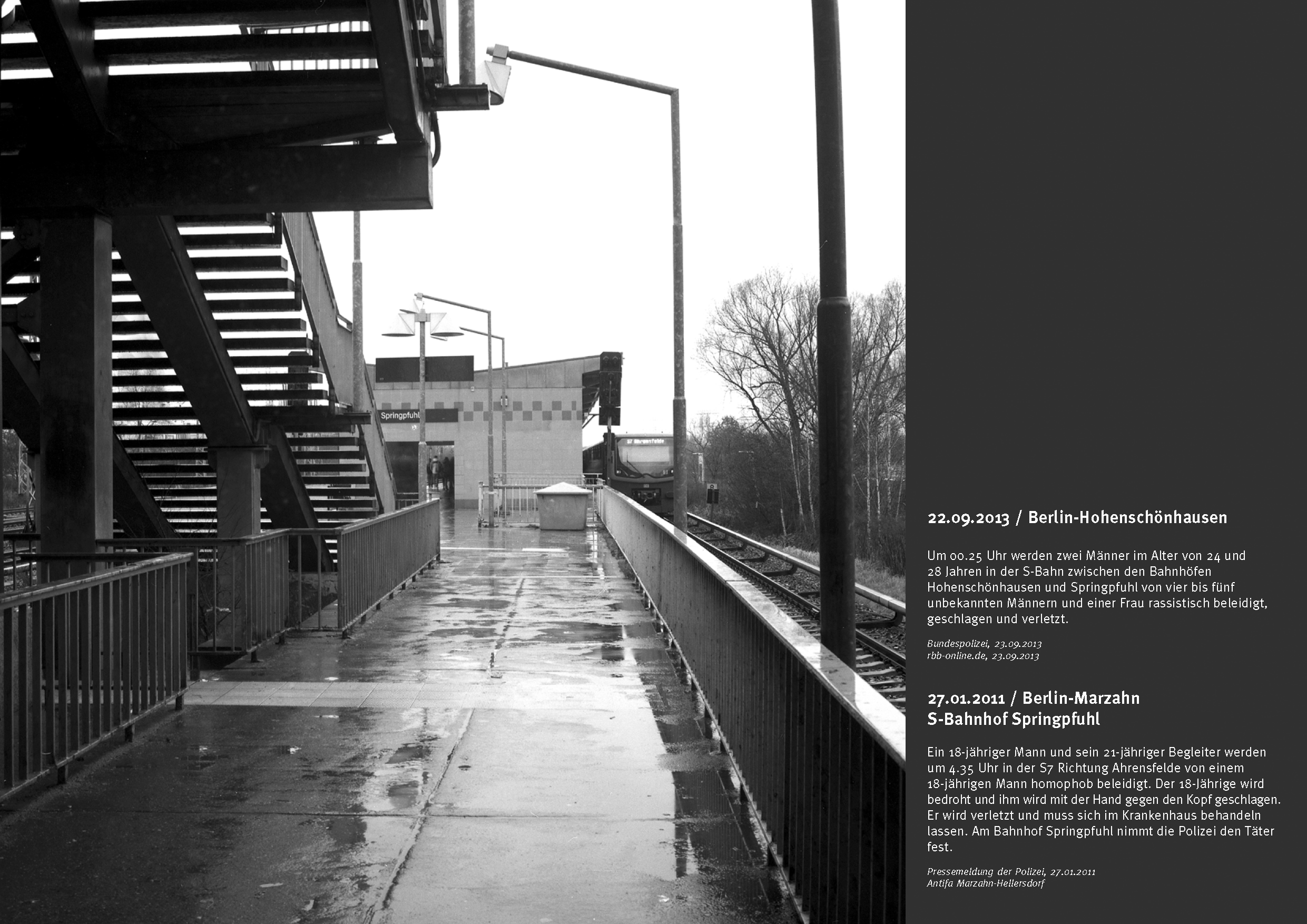 Die Ausstellung ist ein Appell, nicht wegzuschauen, sich einzumischen und Hilfe zu holen, wenn Andere bedroht und angegriffen werden – auch und gerade an den uns so vertrauten Orten, an denen Vielen das Recht abgesprochen wird, sich dort - wie alle anderen auch - aufzuhalten und ihren Alltag zu leben.