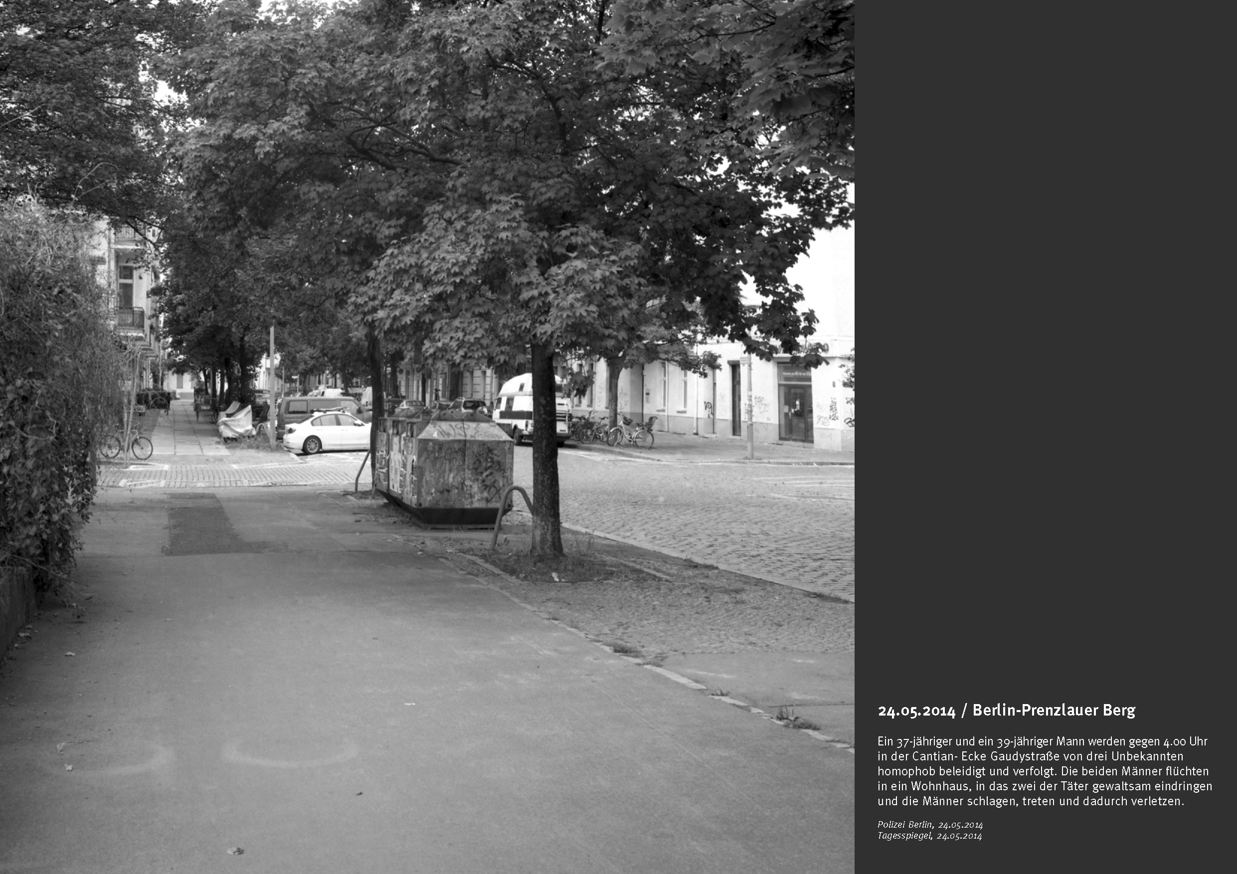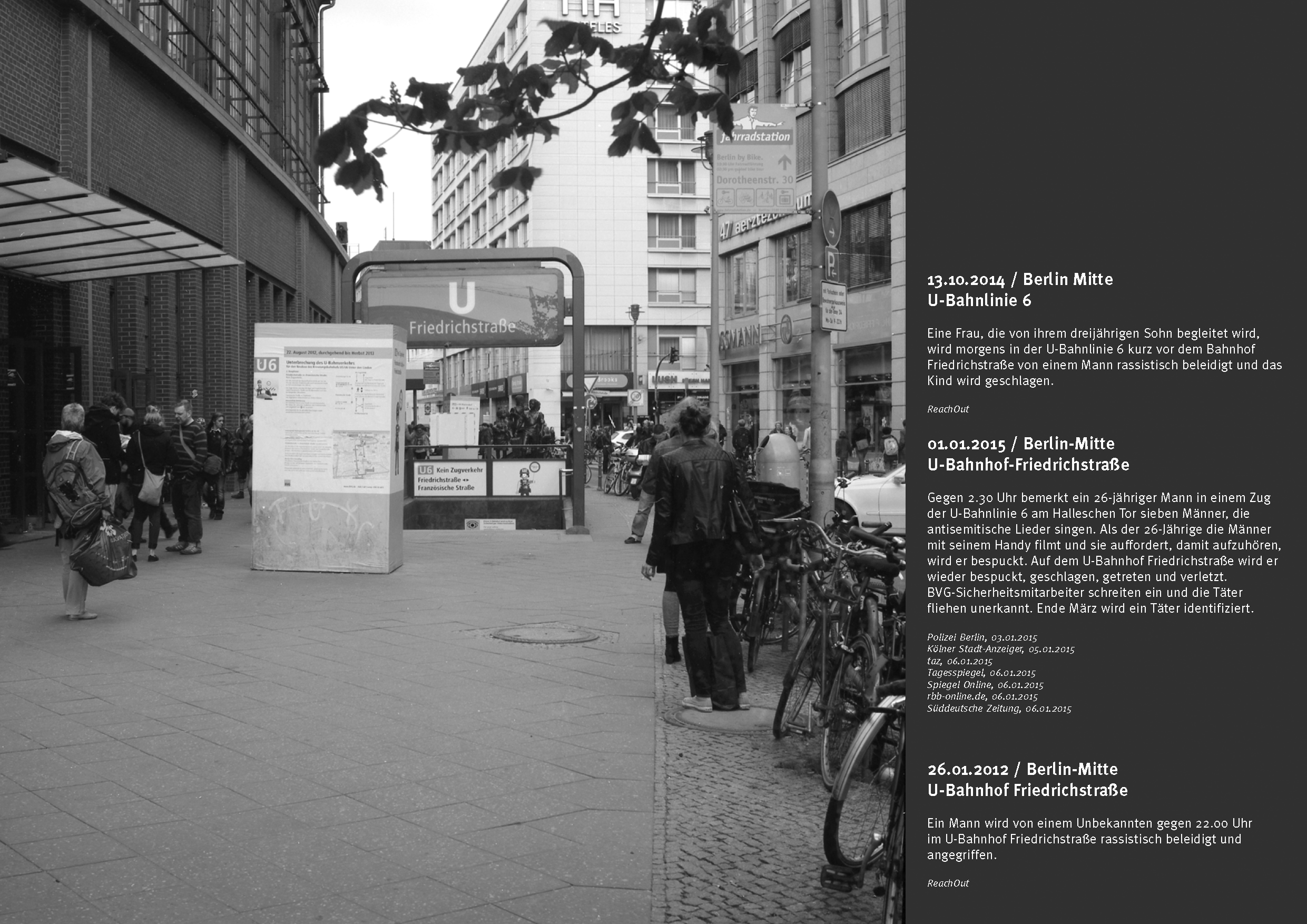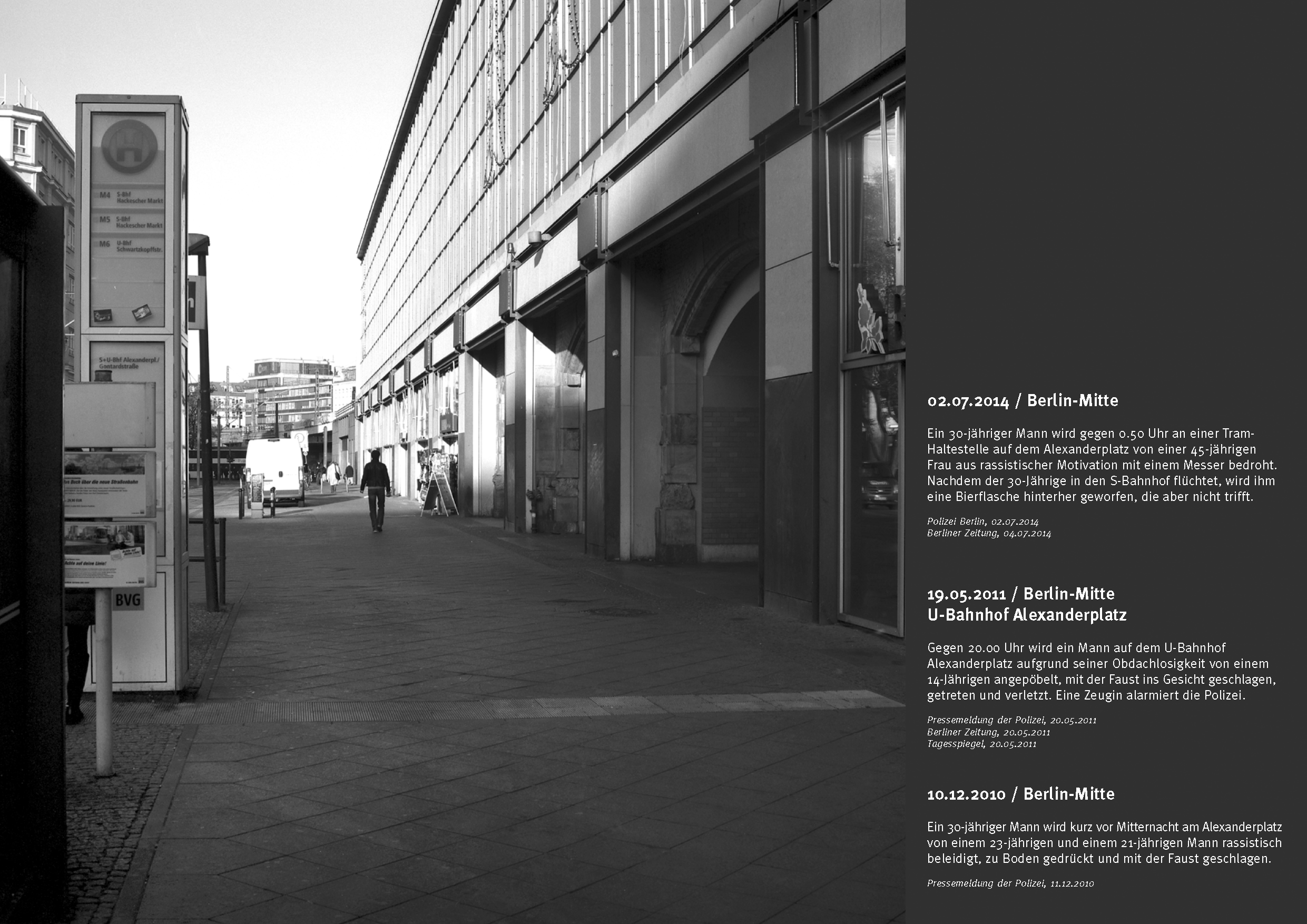 Die Ausstellung ist ein Appell, nicht wegzuschauen, sich einzumischen und Hilfe zu holen, wenn Andere bedroht und angegriffen werden – auch und gerade an den uns so vertrauten Orten, an denen Vielen das Recht abgesprochen wird, sich dort - wie alle anderen auch - aufzuhalten und ihren Alltag zu leben.