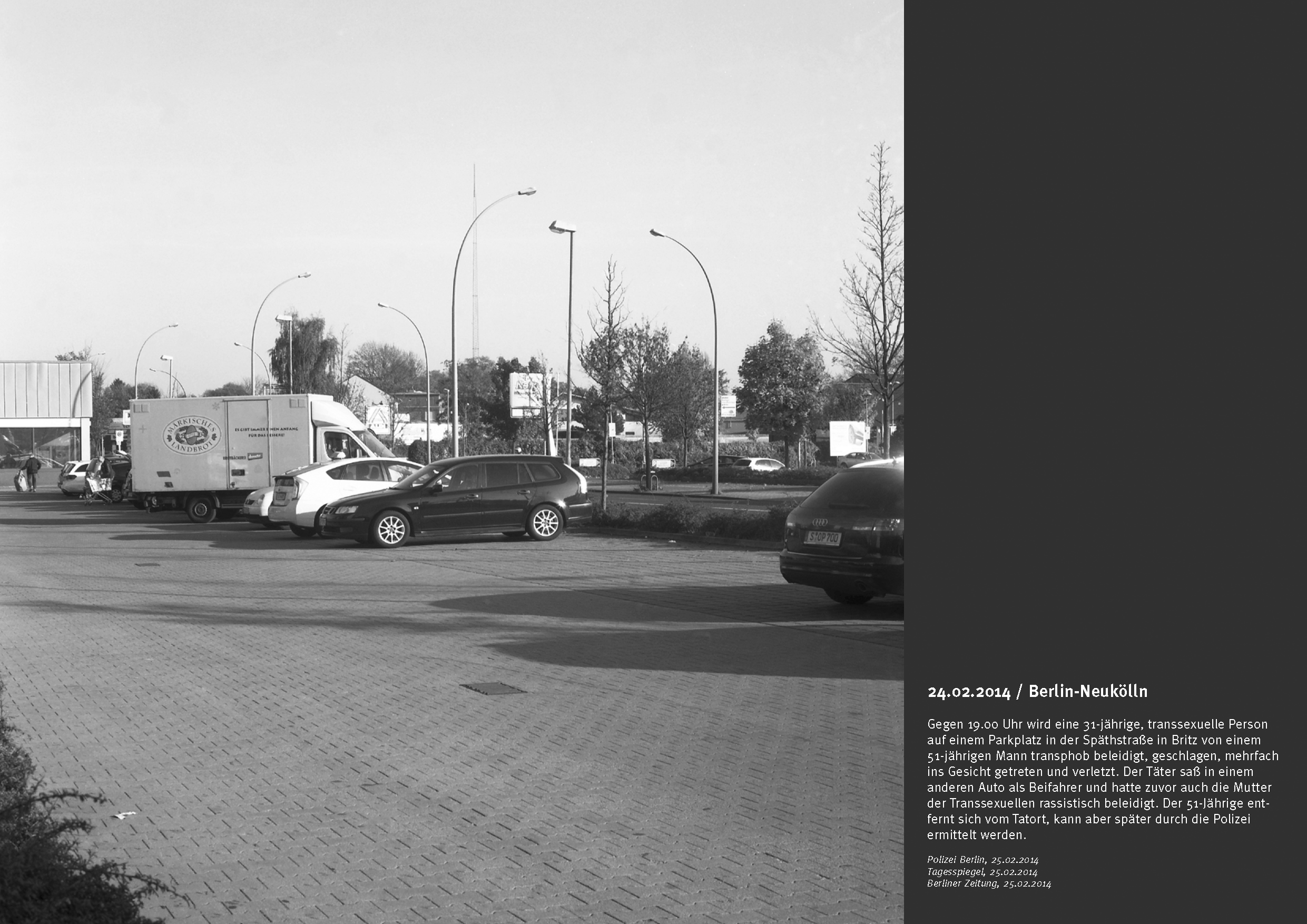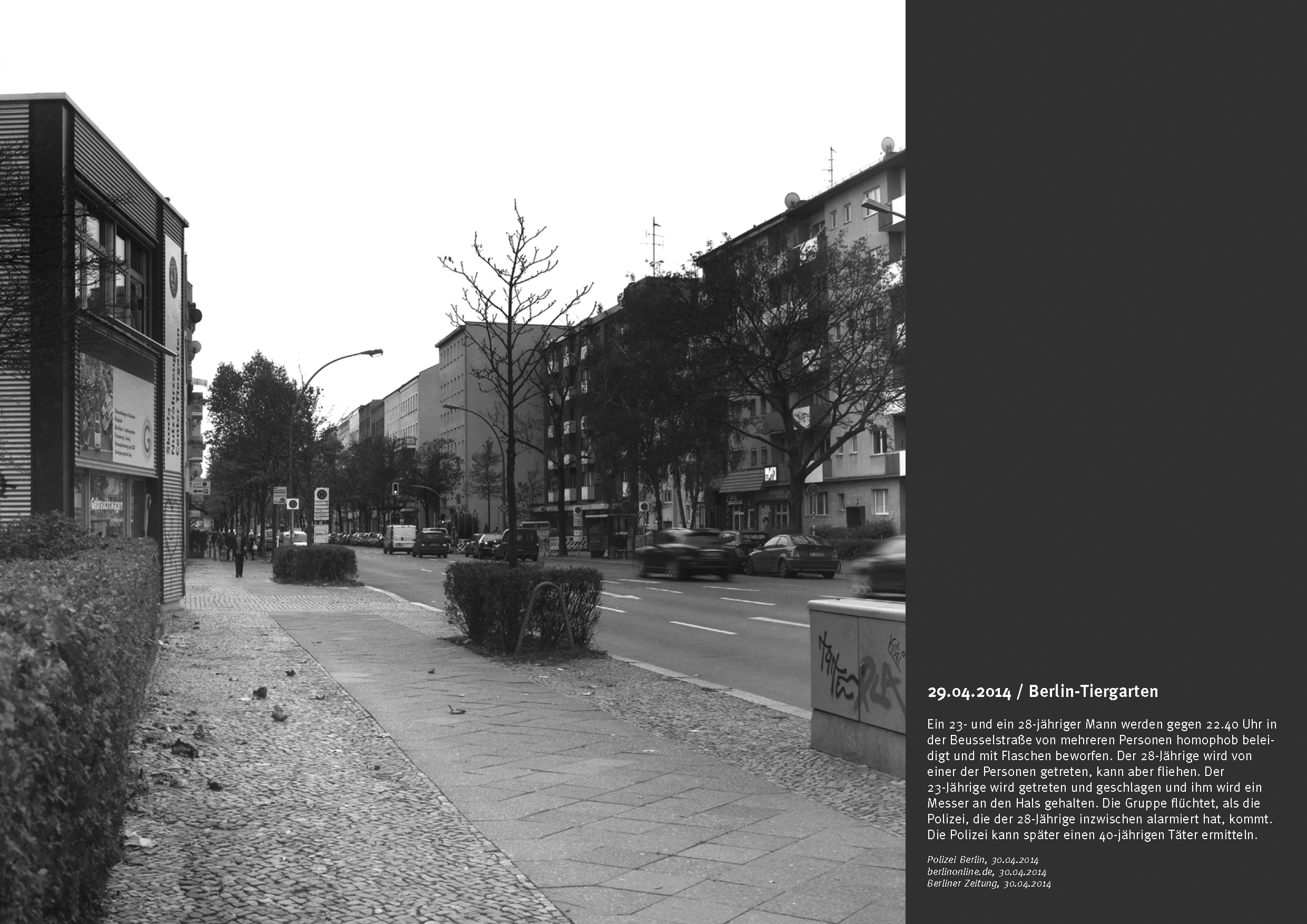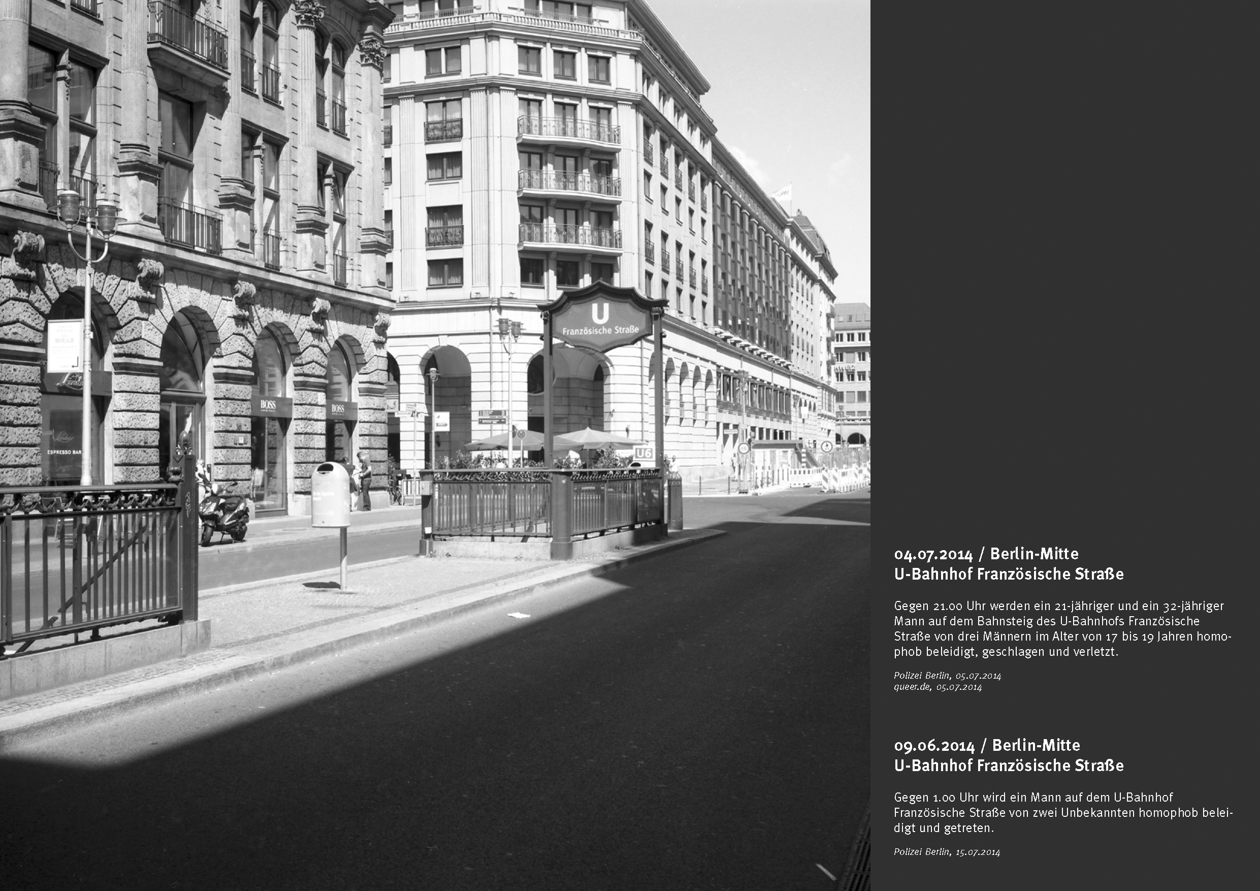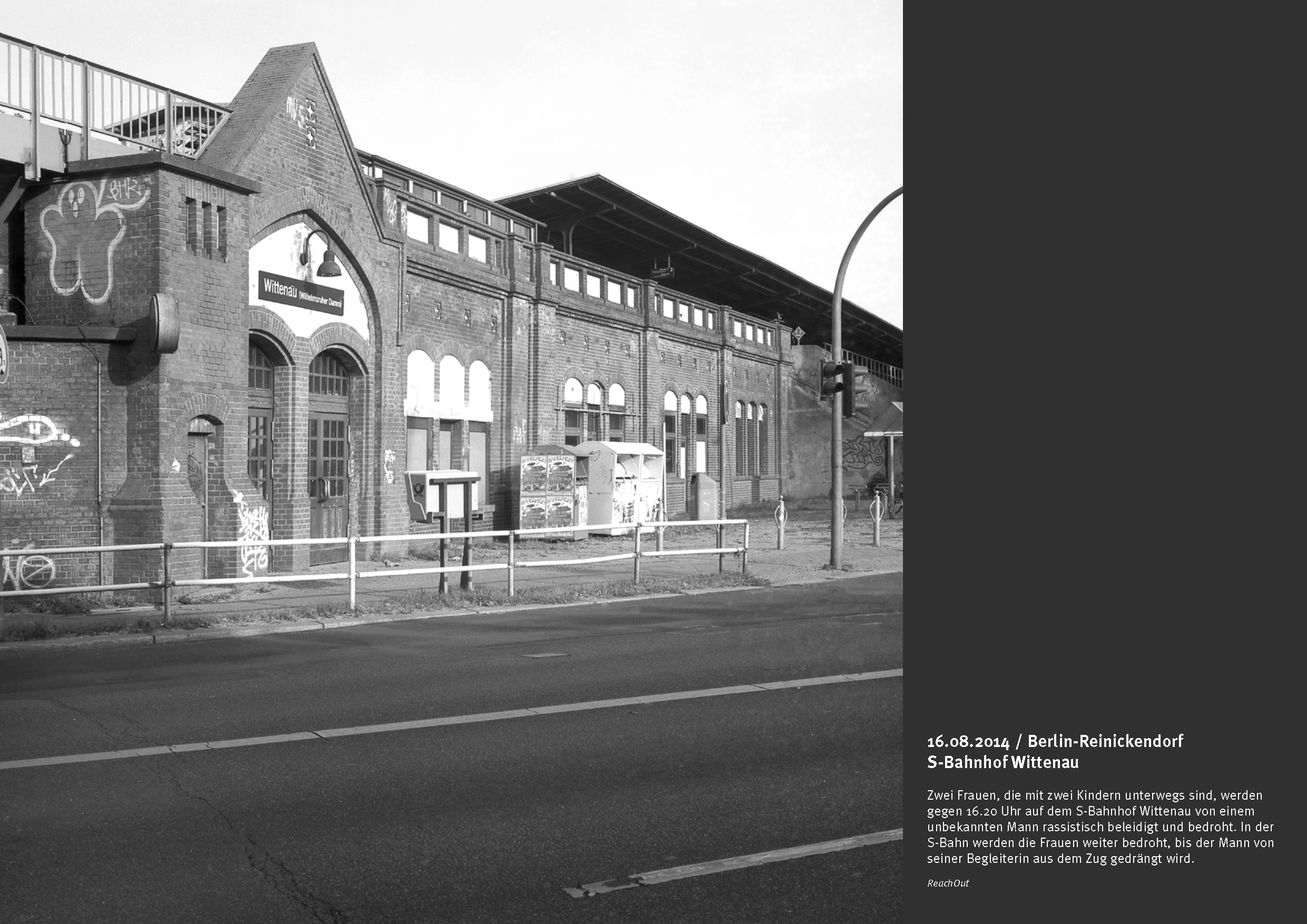 Die Ausstellung ist ein Appell, nicht wegzuschauen, sich einzumischen und Hilfe zu holen, wenn Andere bedroht und angegriffen werden – auch und gerade an den uns so vertrauten Orten, an denen Vielen das Recht abgesprochen wird, sich dort - wie alle anderen auch - aufzuhalten und ihren Alltag zu leben.