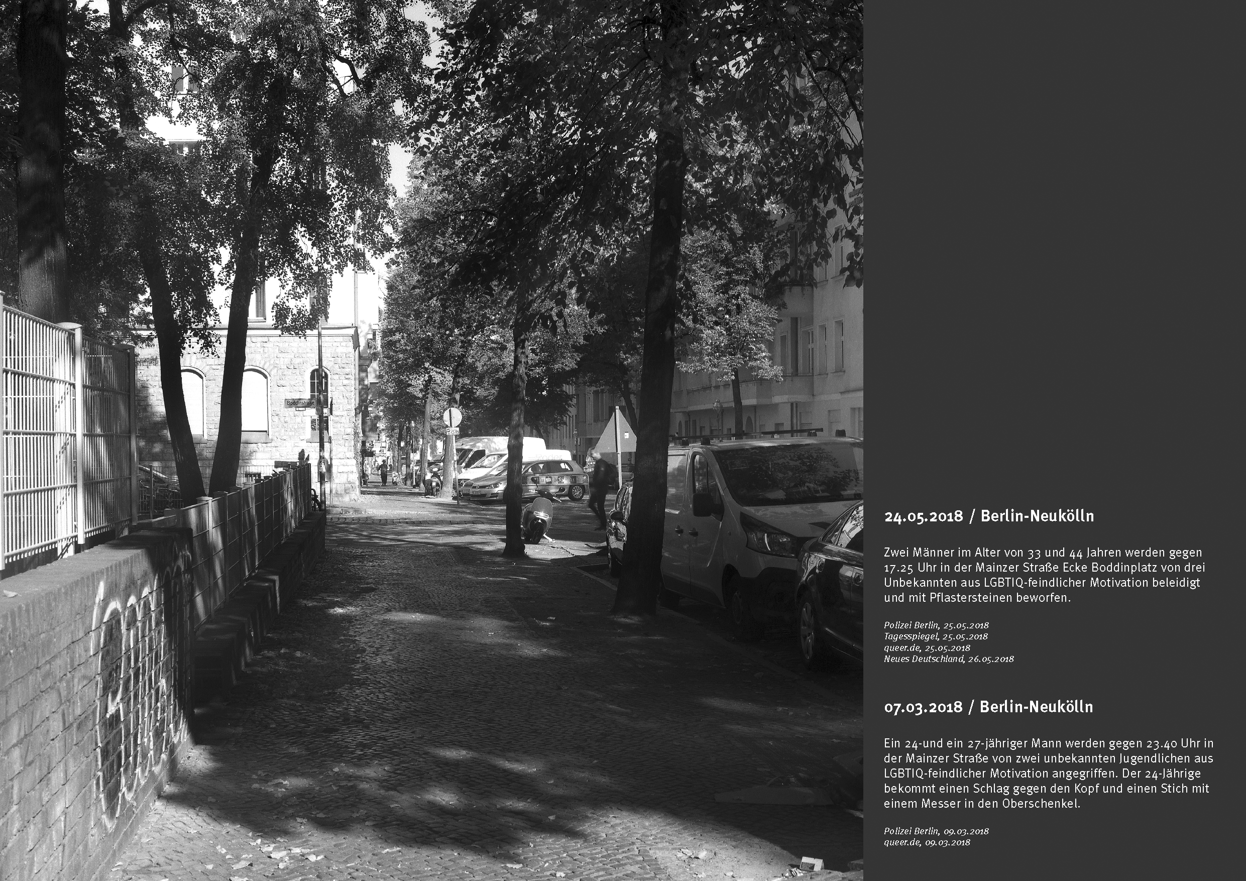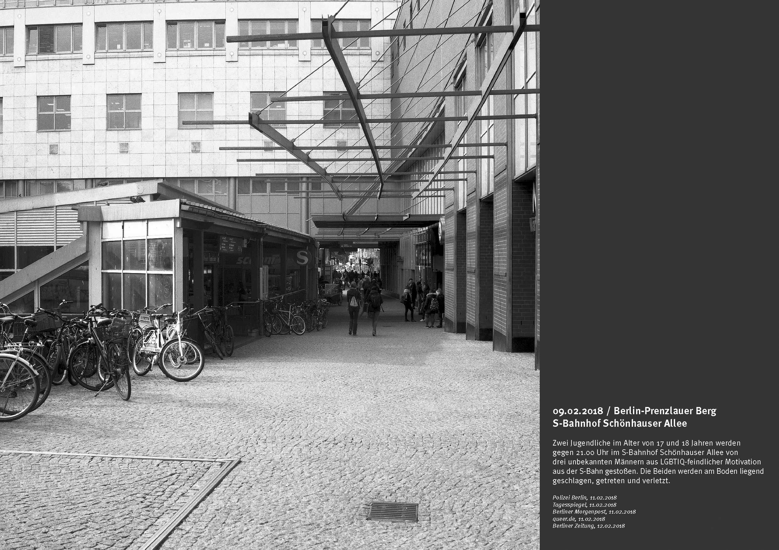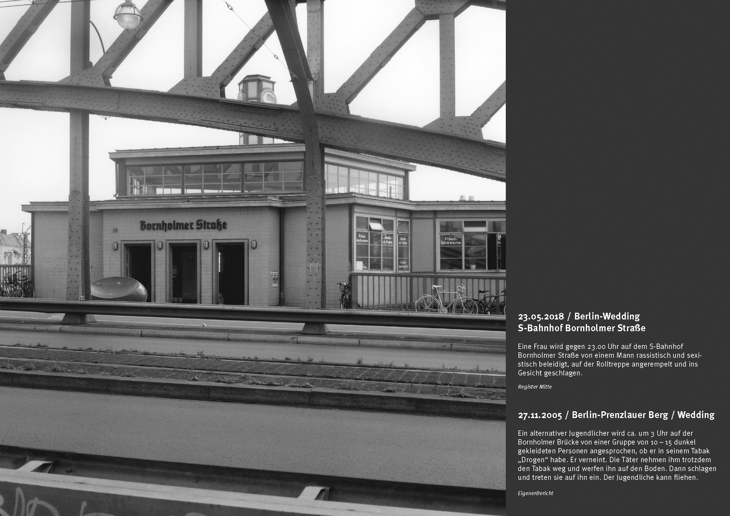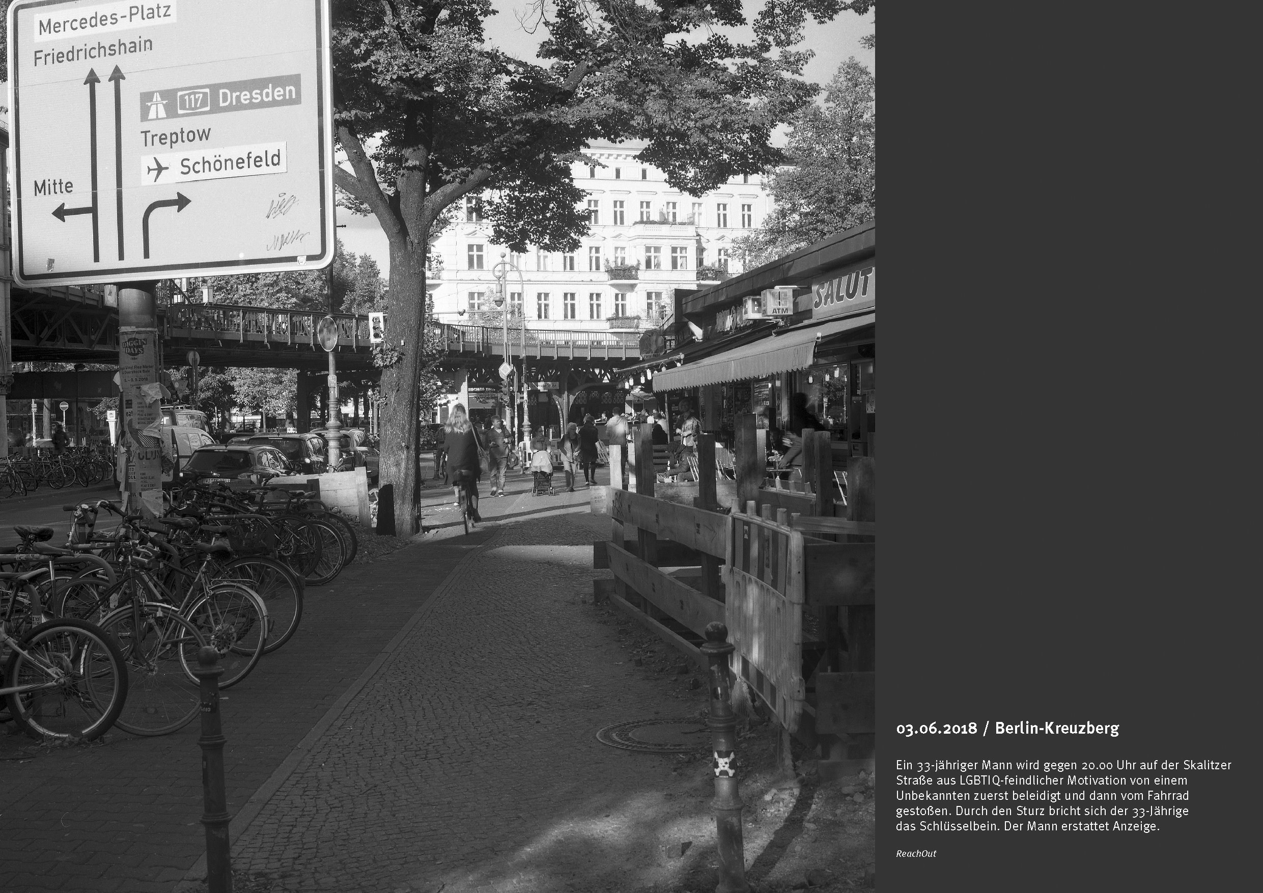 Die Ausstellung ist ein Appell, nicht wegzuschauen, sich einzumischen und Hilfe zu holen, wenn Andere bedroht und angegriffen werden – auch und gerade an den uns so vertrauten Orten, an denen Vielen das Recht abgesprochen wird, sich dort - wie alle anderen auch - aufzuhalten und ihren Alltag zu leben.