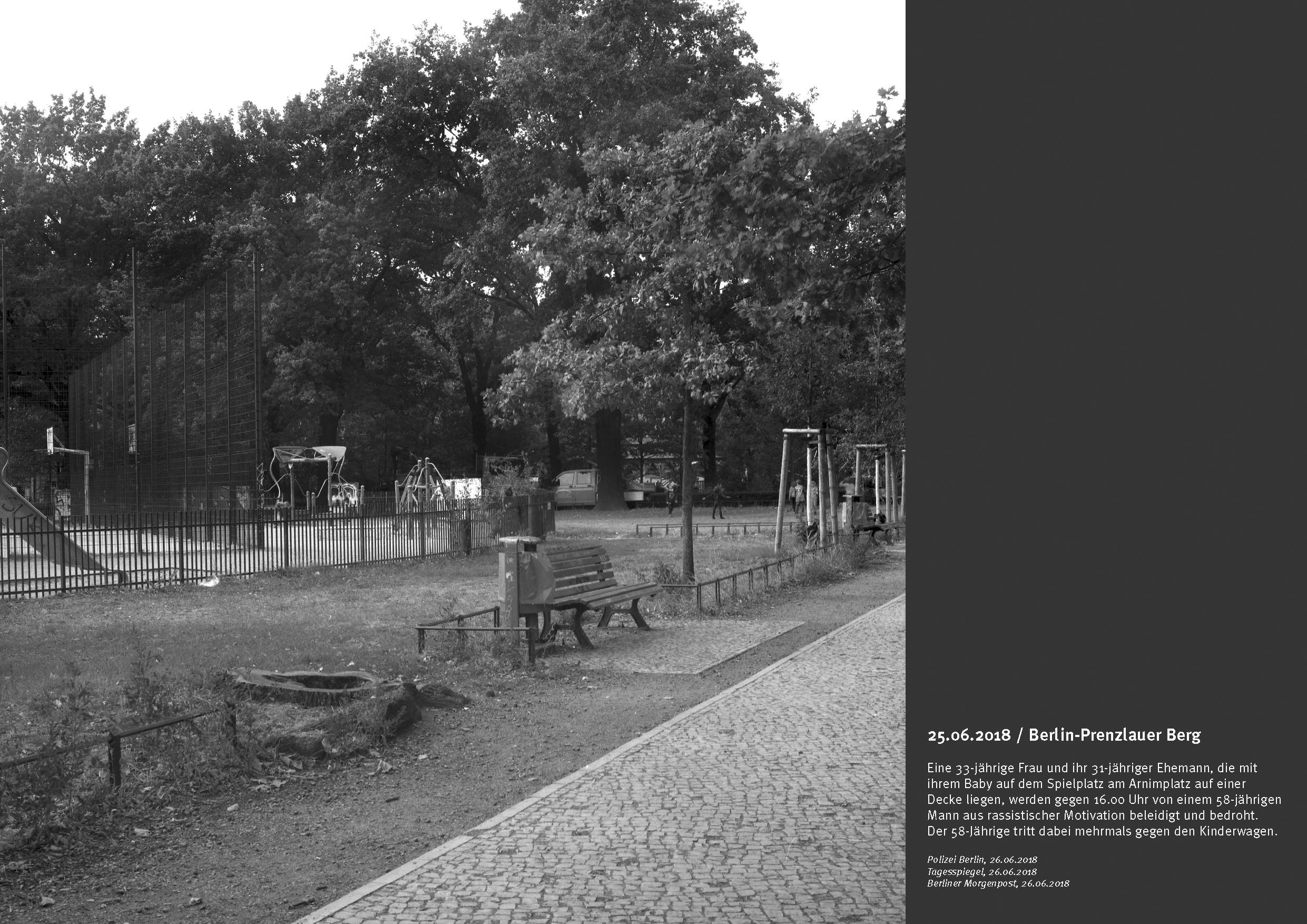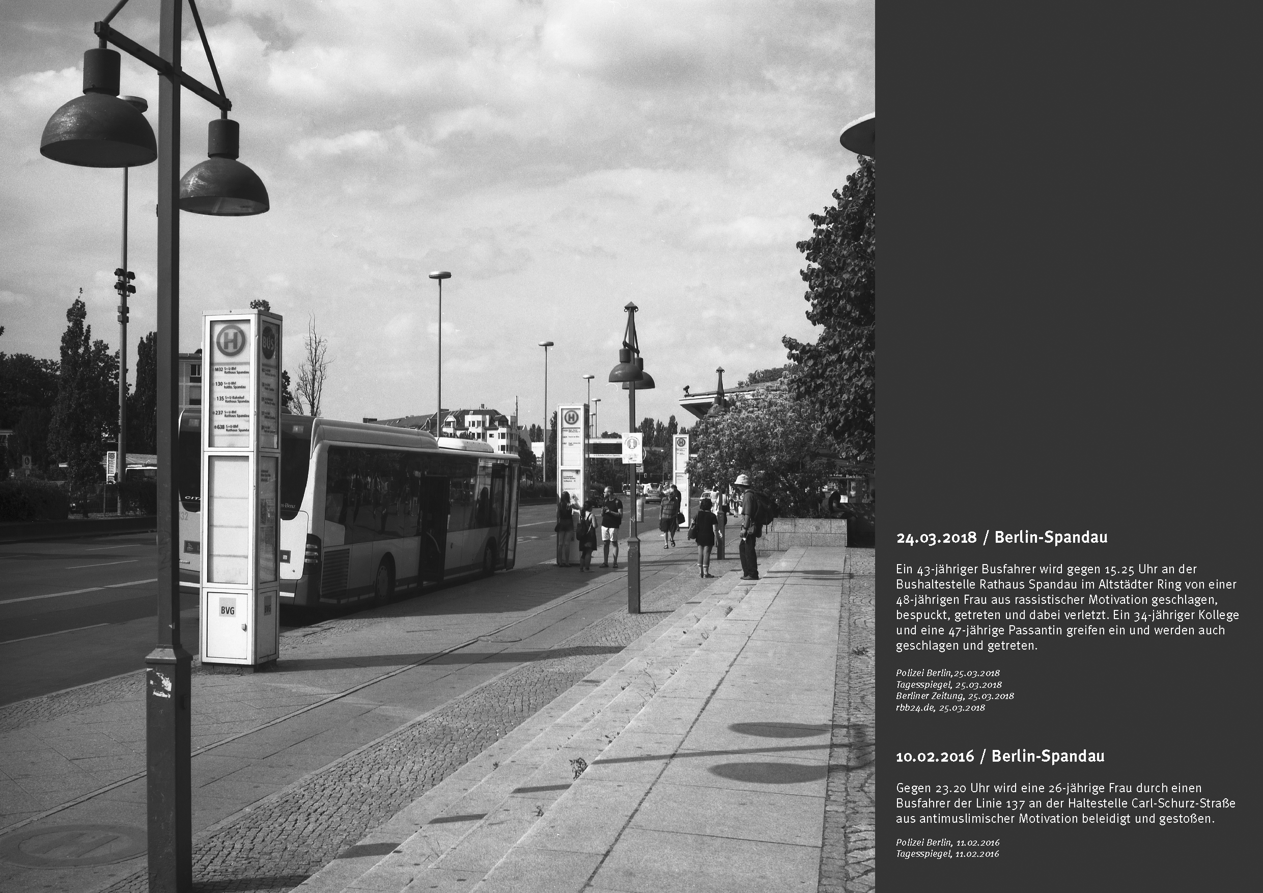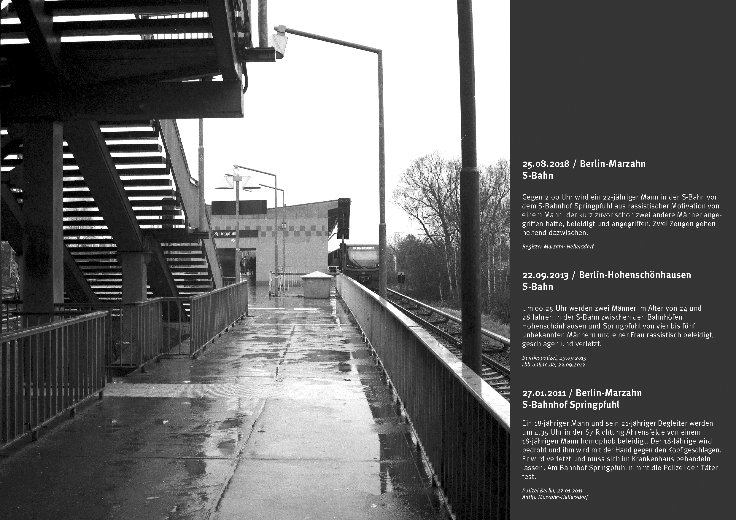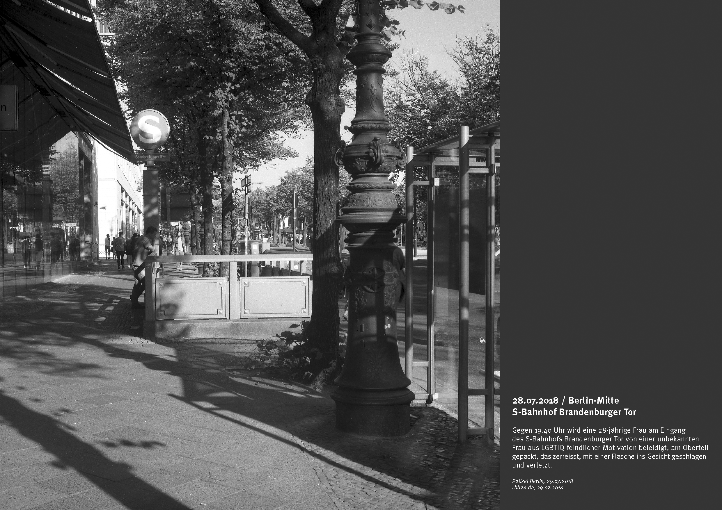 Die Ausstellung ist ein Appell, nicht wegzuschauen, sich einzumischen und Hilfe zu holen, wenn Andere bedroht und angegriffen werden – auch und gerade an den uns so vertrauten Orten, an denen Vielen das Recht abgesprochen wird, sich dort - wie alle anderen auch - aufzuhalten und ihren Alltag zu leben.