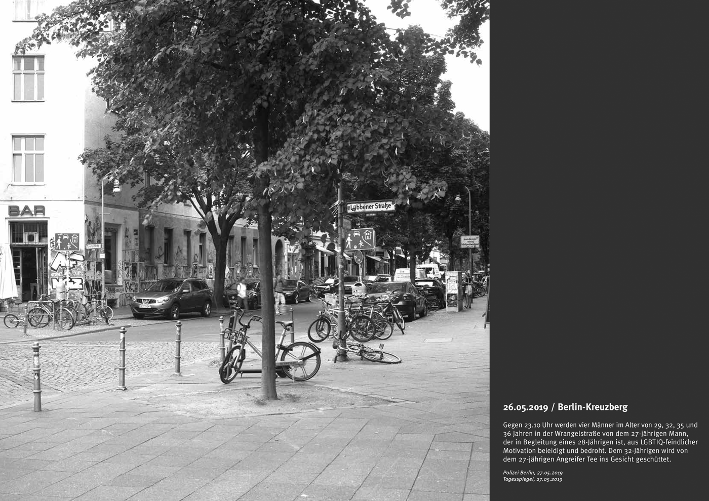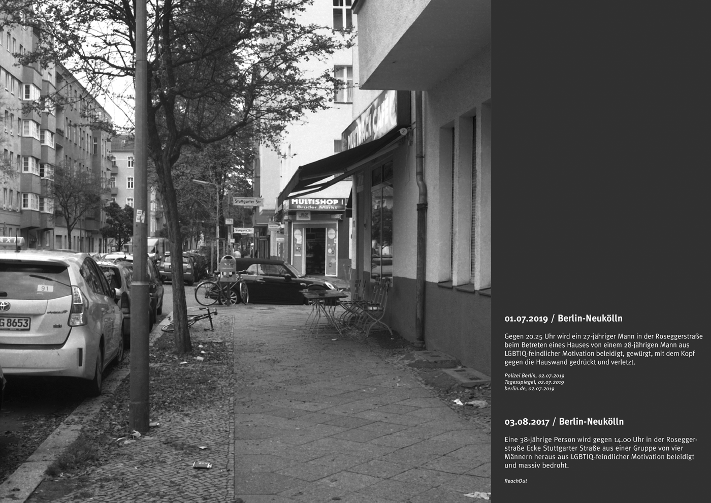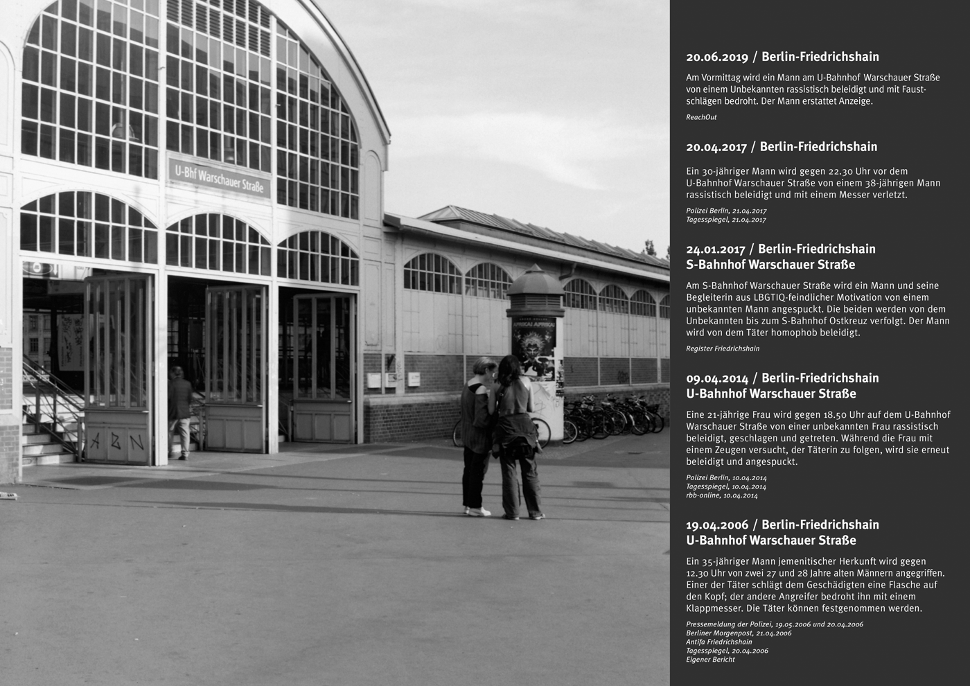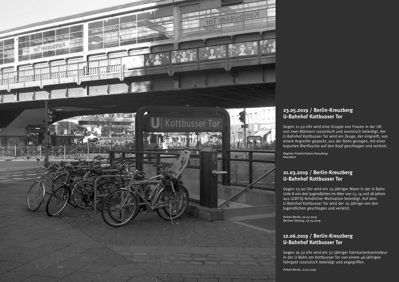Die Ausstellung ist ein Appell, nicht wegzuschauen, sich einzumischen und Hilfe zu holen, wenn Andere bedroht und angegriffen werden – auch und gerade an den uns so vertrauten Orten, an denen Vielen das Recht abgesprochen wird, sich dort - wie alle anderen auch - aufzuhalten und ihren Alltag zu leben.