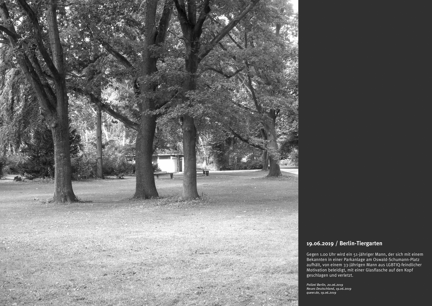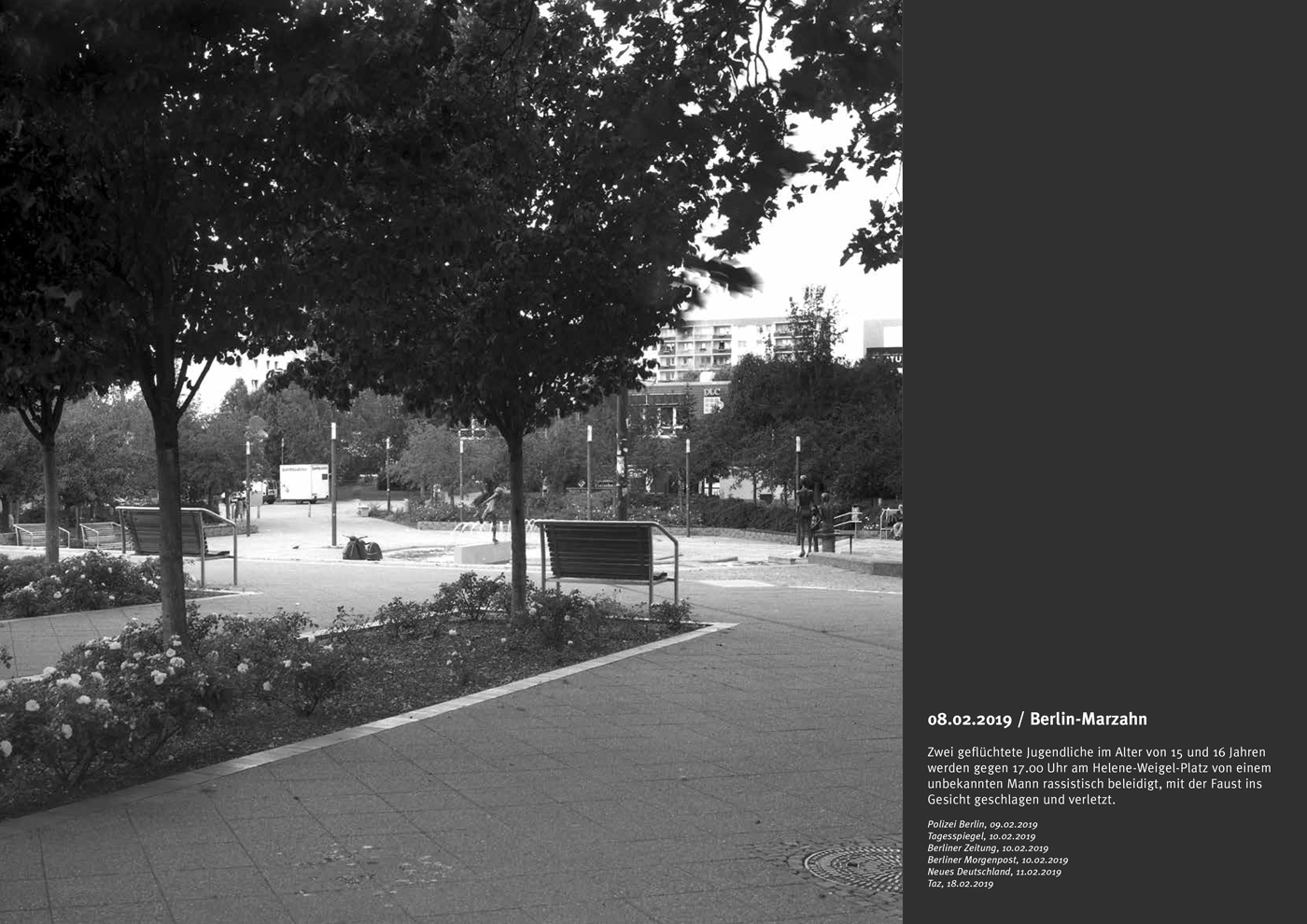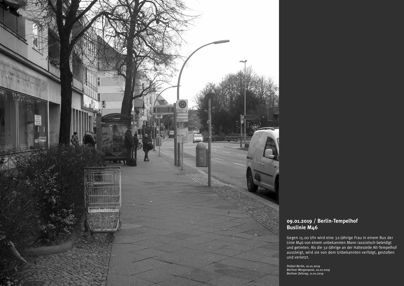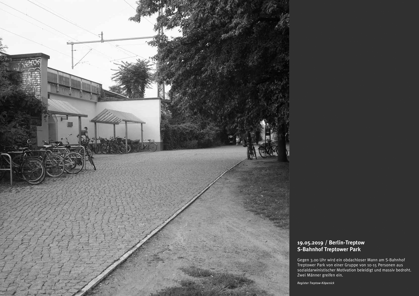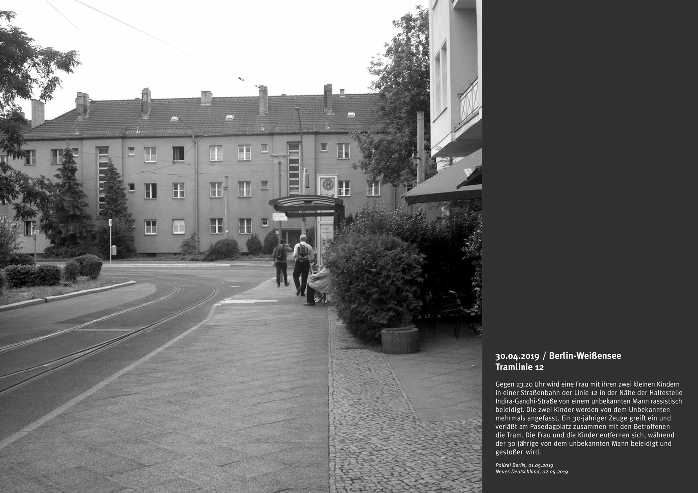 Die Ausstellung ist ein Appell, nicht wegzuschauen, sich einzumischen und Hilfe zu holen, wenn Andere bedroht und angegriffen werden – auch und gerade an den uns so vertrauten Orten, an denen Vielen das Recht abgesprochen wird, sich dort - wie alle anderen auch - aufzuhalten und ihren Alltag zu leben.